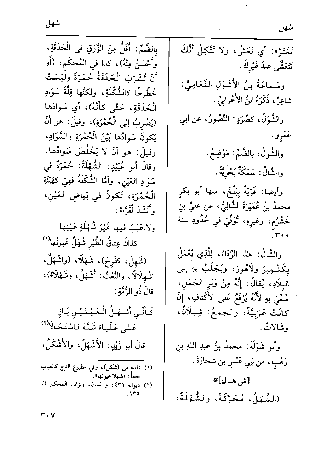 الشَّهَلُ، مُحَرَّكَةً، والشَّهْلَةُ، بالضَّمِّ: أَقَلُّ مِنَ الزَّرَقِ فِي الْحَدَقَةِ، وأَحْسَنُ مِنْهُ، كَذَا فِي المُحْكَمِ، أَو أنء تُشْرَبَ الْحَدَقَةُ حُمْرَةً وليْسَتْ خُطوطاً كالشُّكْلَةِ، ولكنَّها قِلَّةُ سَوادِ الْحَدَقَةِ، حَتَّى كأَنَّهُ، أَي سَوادَها يَضْرِبُ إِلى الْحُمْرَةِ والسَّوادِ، وقيلَ: هُوَ أنْ لَا يَخْلُصَ سَوادُها. وقالَ أَبُو عُبَيْدٍ: الشُّهْلَةُ: حُمْرَةٌ فِي سَوادِ العَيْنِ، وأمَّا الشُّكْلَةُ فهيَ كهَيْئَةِ الْحُمْرَةِ، تَكونُ فِي بَياضِ العَيْنِ، وأَنْشَدَ الْفَرَّاءُ: