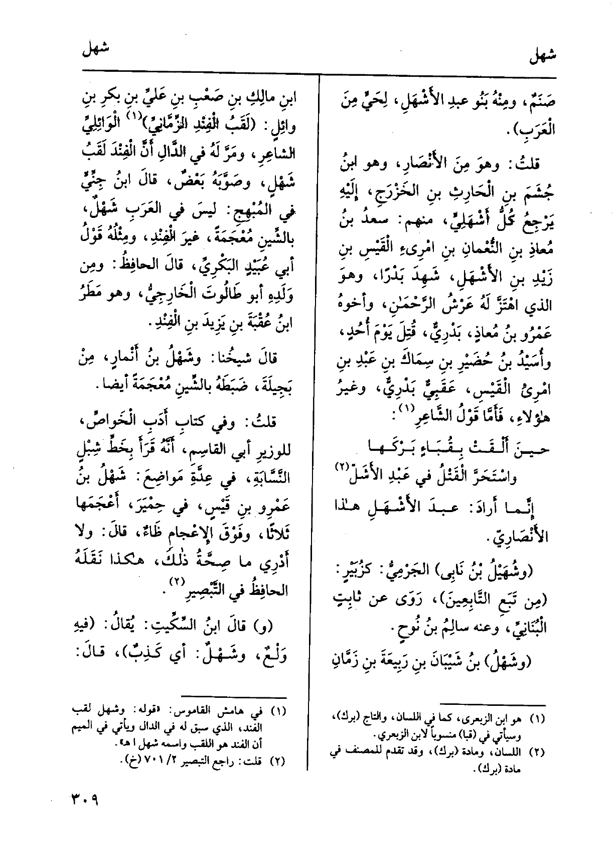إِنَّما أَرادَ: عبدَ الأَشْهَلِ هَذَا الأَنْصَارِيّ. وشُهَيْلُ بْنُ نَابِي الجَرْمِيُّ: كزُبَيْرٍ: مِن تَبَعِ التَّابِعِينَ، رَوَى عَن ثابِتٍ الْبُنَانِيِّ، وَعنهُ سالِمُ بنُ نُوحٍ. وشَهْلُ بنُ شَيْبَانَ بنِ رَبِيعَةَ بنِ زَمَّانِ ابنِ مالِكِ بنِ صَعْبِ بنِ عَلِيِّ بنِ بكرِ بنِ وائِلٍ: لَقَبُ الْفِنْدِ الزِّمَّانِيِّ الوائِلِيّ الشاعِرِ، ومَرّض لَهُ فِي الدَّالِ أَنَّ الْفِنْدَ لَقَبُ شَهْلٍ، وصَوْبَهُ بَعْضٌ، قالَ ابنُ جِنِّيٍ فِي المُبْهِجِ: ليسَ فِي العَرَبِ شَهْلٌ، بالشِّينِ مُعْجَمَةً، غيرَ الفِنْدِ، ومِثْلُهُ قَوْلُ أَب عُبَيْدٍ البَكْرِيِّ، قالَ الحافِظُ: ومِن وَلَدِهِ أَبُو طَالُوتَ الْخَارِجِيُّ، وَهُوَ مَطَرُ ابنُ عُقْبَةَ بنِ يَزِيدَ بنِ الْفِنْدِ. قالَ شيخُنا: وشَهْلُ بنُ أَنمارٍ، مِنْ بَجِيلَةَ، ضَبَطَهُ بالشِّينِ مُعْجَمَةً أَيْضا. قلتُ: وَفِي كتابِ أَدَبِ الْخَواصِّ، للوزيرِ أبي القاسِمِ، أَنَّهُ قَرَأَ بِخَطِّ شِبْلٍ النَّسَّابَةِ، فِي عِدَّةِ مَواضِعَ: شَهْلُ بنُ عَمْرِو بنِ قَيْسٍ فِي حِمْيَرَ، أَعْجَمَها ثَلاثاً، وفَوْقَ الإِعْجامِ ظَاءٌ، قالَ: وَلَا أَدْرِي مَا صِحَّةُ ذلكَ، هَكَذَا نَقَلَهُ الحافِظُ فِي التَّبْصِيرِ. وقالَ ابنُ السِّكِّيتِ: يُقالُ: فيهِ وَلْعٌ، وشَهْلٌ: أَي كَذِبٌ، قالَ: