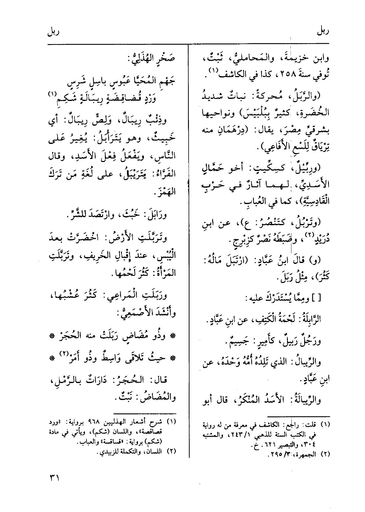 وَابْن خزيمةَ، والمَحامليُّ، ثَبْتٌ، تُوفي سنةَ، كَذَا فِي الكاشف. والرَّبَلُ، مُحركةً: نباتٌ شديدُ الخُضَرةِ، كثيرٌ بِبُلْبَيْسَ ونواحيها بشرقيِّ مِصْرَ، يُقَال: دِرْهَمَانِ مِنْهُ تِرْيَاقٌ لِلَسْعِ الأَفَاعِي. ورِبِّيلٌ، كسِكِّيتٍ: أَخُو حَمَّالٍ الأَسَدِيِّ، لَهما آثارٌ فِي حَرٍ بِ الْقَادِسِيَّةِ، كَمَا فِي العُبابِ. وتَرْبُلُ، كتَنْصُرُ: ع، عَن ابنِ دُرَيْدٍ، وضَبَطَهُ نَصْرٌ كزِبْرِجٍ. وقالَ ابنُ عَبَّادٍ: ارْتَبَلَ مَالُهُ: كَثُرَ، مِثْلُ رَبَلَ. وممّا يُسْتَدْرَكُ عَلَيْهِ: الرَّابِلَةُ: لَحْمَةُ الْكَتِفِ، عَن ابنِ عَبَّادٍ. ورَجُلٌ رَبِيلٌ، كأَمِيرٍ: جَسِيمٌ. والرِّيبالُ: الَّذِي تَلِدُهُ أُمُّهُ وَحْدَهُ، عَن ابنِ عَبَّادٍ. والرِّيبالَةُ: الأَسَدُ المُنْكَرُ، قَالَ أَبُو صَخْرٍ الهُذَلِيُّ: