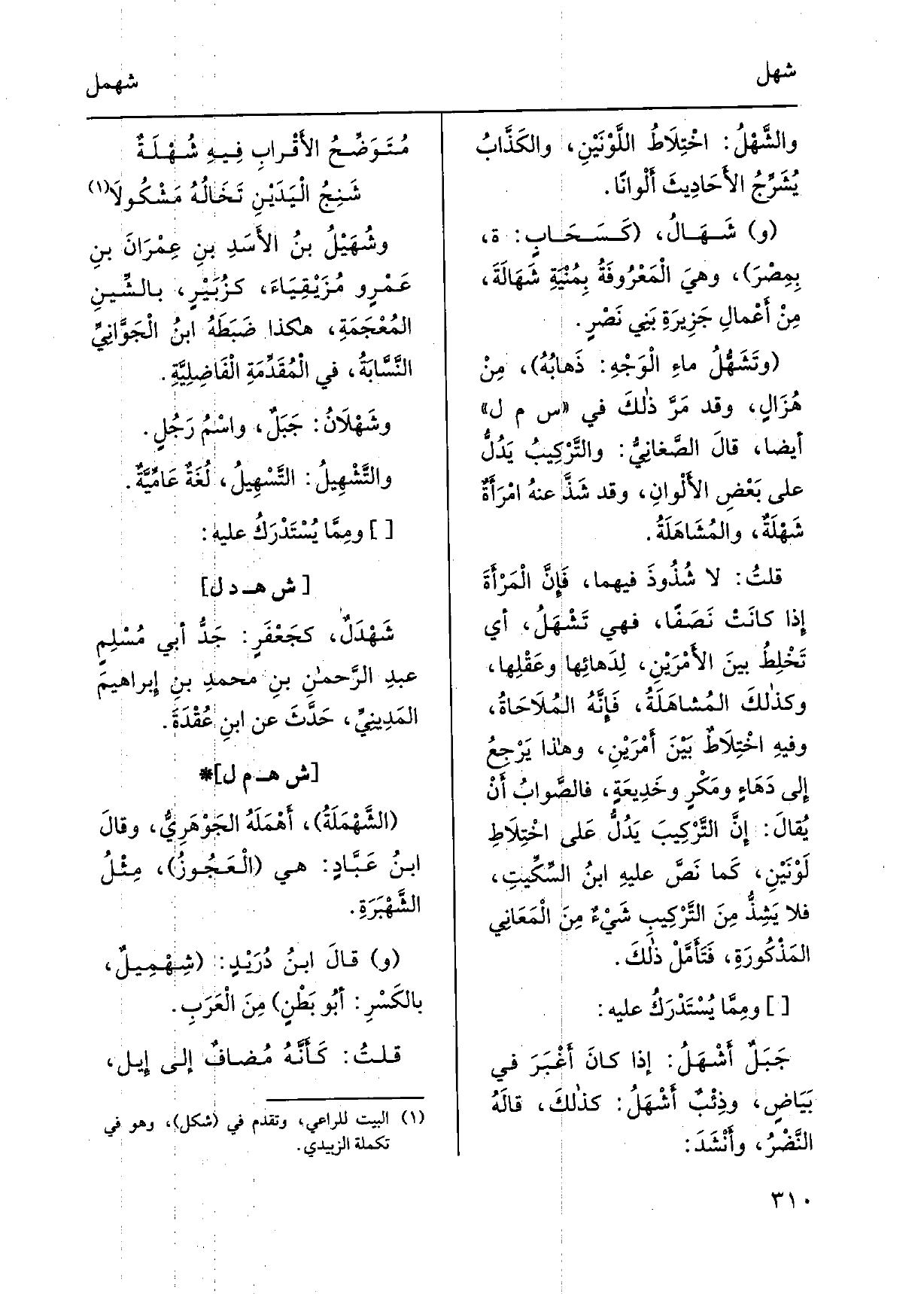 والشَّهْل: اخْتِلاَطُ اللّوْنَيْنِ، والكَذَّابُ يُشَرِّجُ الأَحادِيثَ أَلْواناً. وشَهَالُ، كَسَحابٍ: ة، بِمِصْرَ، وهيَ الْمَعْرُوفَةُ بِمُنْيَةِ شَهَالَةَ، مِنْ أَعْمالِ جَزِيرَةِ بَنِي نَصْرٍ. وتَشَهُّلُ ماءِ الْوَجْهِ: ذَهابُهُ، مِنْ هُزَالٍ، وَقد مَرَّ ذلكَ فِي س م ل أَيْضا، قالَ الصَّغانِيُّ: والتَّرْكِيبُ يَدُلُّ على بَعْضِ الأَلوانِ، وَقد شَذَّ عنهُ امْرَأَةٌ شَهْلَةٌ، والمُشَاهَلَةُ. قلتُ: لَا شُذُوذَ فيهمَا، فَإِنَّ الْمَرْأَةَ إِذا كانَتْ نَصَفَاً، فَهِيَ تَشْهَلُ، أَي تَخْلِطُ بَينَ الأَمْرَيْنِ، لِدَهائِها وعَقلِها، وكذلكَ المُشاهَلَةُ، فَإِنَّهُ المُلاَحَاةُ، وفيهِ اخْتِلاَطٌ بَيْنَ أَمْرَيْنِ، وَهَذَا يَرْجِعُ إِلى دَهَاءٍ ومَكْرٍ وخَدِيعَةٍ، فالصَّوابُ أَنْ يُقالَ: إِنَّ التَّركِيبَ يَدُلُّ عَلى اخْتِلاَطِ لَوْنَيْنِ، كَما نَصَّ عليهِ ابنُ السِّكِّيتِ، فَلَا يَشِذُّ مِنَ التَّرْكِيبِ شَيْءٌ مِنَ الْمَعَانِي المّذْكُورَةِ، فَتَأَمَّلْ ذلكَ. وممّا يُسْتَدْرَكُ عَلَيْهِ: جَبَلٌ أَشْهَلُ: إِذا كانَ أَغْبَرَ فِي بَيَاضٍ، وذِئْبٌ أَشْهَلُ: كَذَلِك، قالَهُ النَّضْرُ، وأَنْشَدَ: