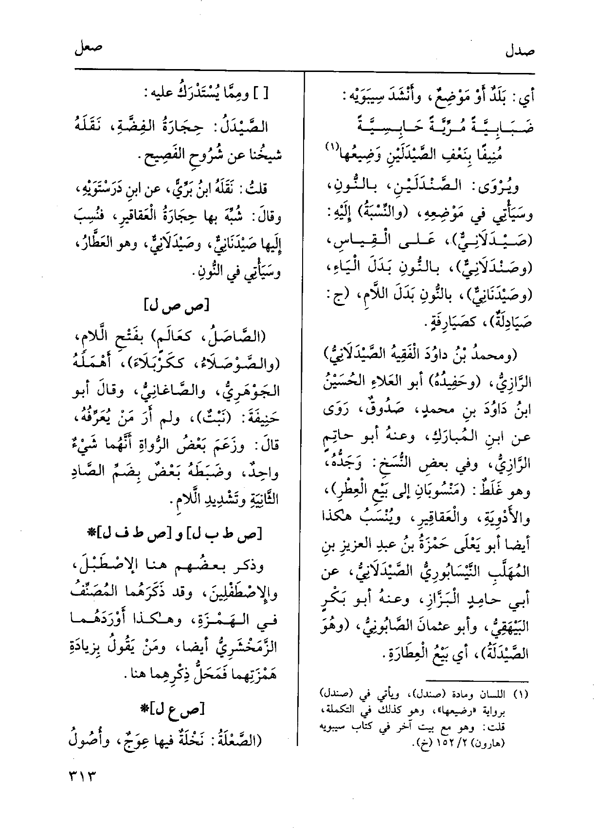 ويُرْوَى: الصَّنْدَلَيْنِ، بالنُّونِ، وسَيَأْتِي فِي مَوْضِعِهِ، والنِّسْبَةُ إِلَيْهِ: صَيْدَلاَنِيٌّ، عَلى الْقِياسِ، وصَنْدَلاَنِيٌّ، بالنُّونِ بَدَلَ الْيَاءِ، وصَيْدَنَانِيٌّ، بالنُّونِ بَدَلَ اللاَّمِ، ج: صَيادِلَةٌ، كصَيارِفَةٍ. ومحمدُ بْنُ داوُدَ الْفَقِيهُ الصَّيْدَلاَنِيُّ الرَّازِيُّ، وحَفِيدُهُ أَبُو العَلاءِ الحُسَيْنُ ابنُ داوُدَ بنِ محمدٍ، صَدُوقٌ، رَوَى عَن ابنِ المُبارَكِ، وعنهُ أَبُو حاتِمٍ الرَّازِيُّ، وَفِي بعضِ النُّسَخِ: وَجَدُهُ، وَهُوَ غَلَطٌ: مَنْسُوبَانِ إِلَى بَيْعِ الْعِطْرِ، والأَدْوِيَةِ، والْعَقاقِيرِ، ويُنْسَبُ هَكَذَا أَيْضا أَبُو يَعْلَى حَمْزَةُ بنُ عبدِ العَزِيزِ بنِ المُهَلَّبِ النَّيْسَابُورِيُّ الصَّيْدَلانِيُّ، عَن أبي حامِدٍ الْبَزَّازِ، وعنهُ أَبُو بَكْرٍ البَيْهَقِيُّ، وَأَبُو عُثمانَ الصَّابُونِيُّ، وهُوَ الصَّيْدَلَةُ، أَي بَيْعُ الْعِطارَةِ. وممّا يُسْتَدْرَكُ عَلَيْهِ: الصَّيْدَلُ: حِجَارَةُ الفَضَّةِ، نَقَلَهُ شيخُنا عَن شُرُوحِ الفَصِيحِ. قلتُ: نَقَلَهُ ابنُ بَرِّيٍّ، عَن ابنِ دَرَسْتَوَيْهِ، وقالَ: شُبِّهَ بهَا حِجَارَةُ الْعَقاقِيرِ، فنُسِبَ غِلَيْها صَيْدَنَانِيٌّ، وصَيْدَلاَنِيٌّ، وَهُوَ العَطَّارُ، وسَيأْتِي فِي النُّونِ.