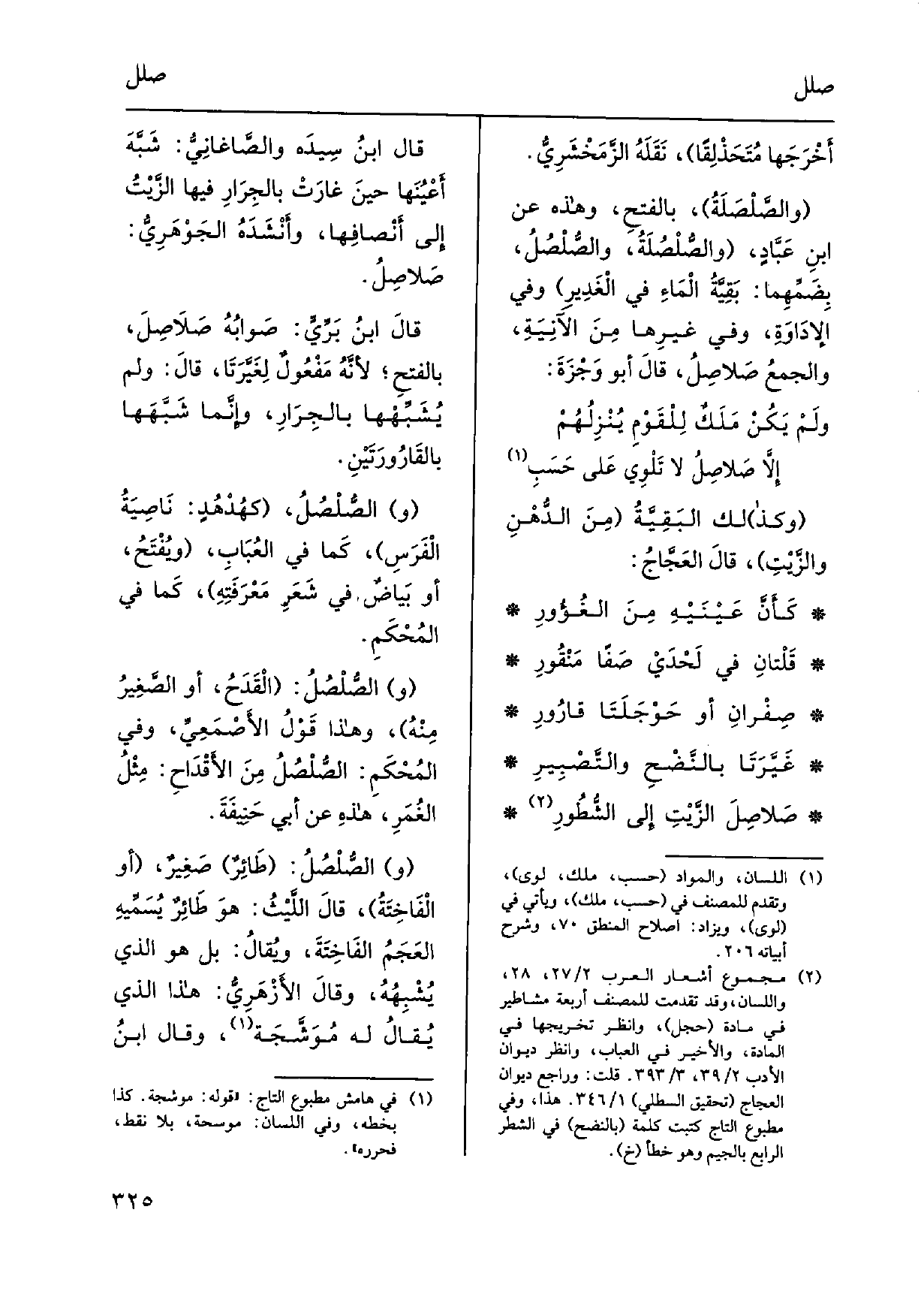 قَالَ ابنُ سِيدَه والصَّاغانِيُّ: شَبَّهَ أَعْيُنَها حينَ غارَتْ بالجِرَارِ فِيهَا الزَّيْتُ إِلَى أنْصافِها، وأنْشَدَهُ الجَوْهَرِيُّ: صَلاصِلُ. قالَ ابنُ بَرِّيٍّ: صَوابُهُ صَلاَصِلَ، بالفتحِ، لأنَّهُ مَفْعُولٌ لِغَيَّرَتَا، قالَ: وَلم يُشْبِّهْها بالجِرَارِ، وإِنَّما شَبَّهها بالقَارُورَتَيْنِ. (و) ! الصُّلْصُلُ، كهُدْهُدٍ: نَاصِيَةُ الْفَرَسِ، كَما فِي العُبَابِ، ويُفْتَحُ، أَو بَياضٌ فِي شَعَرِ مَعْرَفَتِهِ، كَما فِي المُحْكَمِ. والصَّلْصُلُ: الْقَدَحُ، أَو الصَّغِيرُ مِنْهُ، وَهَذَا قَوْلُ الأَصْمَعِيِّ، وَفِي المُحْكَمِ: الصُّلْصُلُ مِنَ الأَقْدَاحِ: مِثْلُ الغُمَرِ، هذِه عَن أبي حَنِيفَةَ.