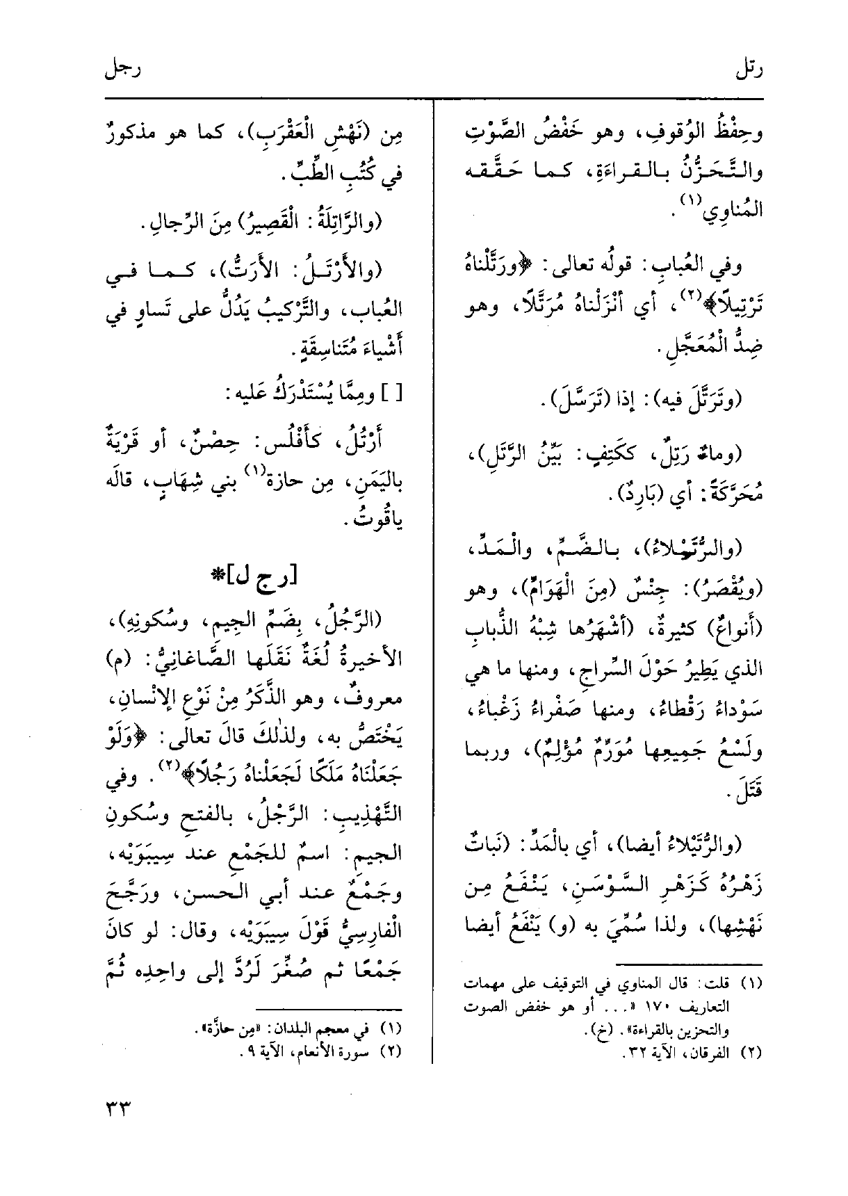 وحِفْظُ الوُقوفِ، وَهُوَ خَفْضُ الصَّوْتِ والتَّحَزُّنُ بالقراءَةِ، كَمَا حَقَّقه المُناوِي. وَفِي العُبابِ: قولُه تَعَالَى: ورَتَّلْناهُ تَرْتِيلاً، أَي أنْزَلْناهُ مُرَتَّلاً، وَهُوَ ضِدُّ الْمُعَجَّلِ. وتَرَتَّلَ فِيهِ: إِذا تَرَسَّلَ. وماءٌ رَتِلٌ، ككَتِفٍ: بَيِّنُ الرَّتَلِ، مُحَرَّكَةً: أَي بَارِدٌ. والرُّتَيْلاءُ، بالضَّمِّ، والْمَدِّ، ويُقْصَرُ: جِنْسٌ مِنَ الْهَوامِّ، وَهُوَ أَنْواعٌ كثيرةٌ، أشْهَرُها شِبْهُ الذُّبابِ الَّذِي يَطِيرُ حَوْلَ السِّراجِ، وَمِنْهَا مَا هِيَ سَوْداءُ رَقْطاءُ، وَمِنْهَا صَفْراءُ زَغْباءُ، ولَسْعُ جَمِيعِها مُوَرِّمٌ مُؤْلِمٌ، وَرُبمَا قَتَلَ. والرُّتَيْلاءُ أَيْضا، أَي بالْمَدِّ: نَباتٌ زَهْرَهُ كَزَهْرِ السَّوْسَنِ، يَنْفَعُ مِن نَهْشِها، وَلذَا سُمِّيَ بِهِ ويَنْفَعُ أَيْضا مِن نَهْشِ الْعَقْرَبِ، كَمَا هُوَ مذكورٌ فِي كُتُبِ الطِّبِّ. والرَّاتِلَةُ: الْقَصِيرُ مِنَ الرِّجالِ. والأَرْتَلُ: الأَرَتُّ، كَمَا فِي العُباب، والتَّرْكيبُ يَدُلُّ على تَساوٍ فِي أَشْياءَ مُتَناسِقَةٍ. وممّا يُسْتَدْرَكُ عَلَيْهِ: أَرْتُلُ،)