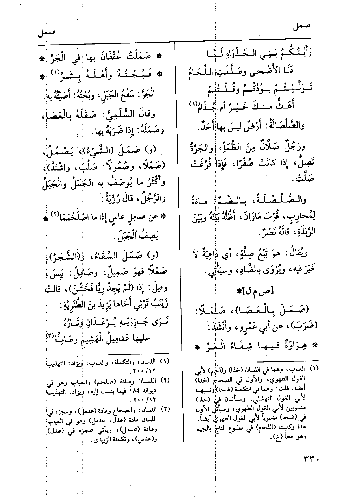 رَأيتكُم بَني الحَذْوَاءِ لَمَّادَنَا الأَضْحى {وصَلَّلَتِ اللِّحامُ تَوَلَّيْتُمْ بؤُدِّكُمُ وقُلْتُمْأَعَكٌّ منكَ خَيْرٌ أم جُذَامُ} والصَّلْصَالَةُ: أرْضُ ليسَ بهَا أَحَدٌ. ورَجُلٌ {صَلاَّلٌ مِنَ الظَّمَأِ، والجَرَّةُ} تَصِلُّ، إِذا كانَتْ صُفْراً، فَإِذا فُرِّغَتْ {صَلّتْ.} والصُّلْصُلَةُ، بالضَّمِّ: ماءَةٌ لِمُحارِبٍ، قُرْبَ مَاوَانَ، أَظُنُّهُ بَيْنَهُ وبَيْنَ الرَّبَذَةِ، قالَهُ نَصْرٌ. ويُقالُ: هوَ تِبْعُ! صِلَّةٍ، أَي دَاهِيَةٌ لَا خَيْرَ فِيهِ، ويُرْوَى بالضَّادِ، وسيَأْتِي.