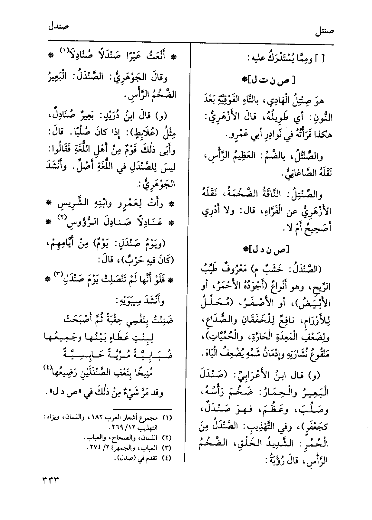 الصَّنْدَلُ: خَشَبٌ م مَعْرُوفٌ طَيِّبُ الرِّيحِ، وَهُوَ أَنْواعٌ أَجْوَدُهُ الأَحْمَرُ، أَو الأَبْيَضُ، أَو الأَصْفَرُ، مُحَلِّلٌ لِلأَوْرامِ، نافِعٌ لِلْخَفَقَانِ والصُّدَاعِ، ولِضَعْفِ الْمَعِدَةِ الْحَارَّةِ، والْحُمِّيَّاتِ، مَنْقُوعُ نُشَارَتِهِ وإِدْمَانُ شَمِّهِ يُضْعِفُ الْبَاهَ. وَقَالَ ابْن الأَعْرابِيِّ: صَنْدَلَ الْبَعِيرُ والْحِمَارُ: ضَخُمَ رَأْسُهُ، وصَلُبَ، وعَظُمَ، فهوَ صَنْدَلٌ، كجَعْفَرٍ، وَفِي التَّهْذِيبِ: الصَّنْدَلُ مِنَ الْحُمُرِ: الشَّدِيدُ الخَلْقِ، الضَّخْمُ الرَّأْسِ، قالَ رُؤْبَةُ: أَنْعَتُ عَيراً صَنْدَلاً صُنْادِلاَ وَقَالَ الجَوْهَرِيُّ: الصَّنْدَلُ: الْبَعِيرُ الضَّخْمُ الرَّأْسِ. وقالَ ابنُ دُرَيْدٍ: بَعِيرٌ صُنَادِلٌ، مِثْلُ عُلاَبِطٍ: إِذا كانَ صُلْباً. قالَ: وأَبَى ذلكَ قَوْمٌ مِنْ أَهْلِ اللُّغَةِ فَقَالُوا: ليسَ للصَّنْدَلِ فِي اللُّغَةِ أَصْلٌ. وأَنْشَدَ الجَوْهَرِيُّ: رَأَتْ لِعَمْرٍ ووابْنِهِ الشَّرِيسِ عَنَادِلاً صَنادِلَ الرُّؤُوسِ ويَوْمُ صَنْدَلٍ: يَوْمٌ مِنْ أيامِهِمْ، كَانَ فيهِ حَرْبٌ، قالَ: فَلَوْ أَنَّها لَمْ تَنْصَلِتْ يَوْمَ صَنْدِلِ وأَنْشَدَ سِيبَوَيهِ: