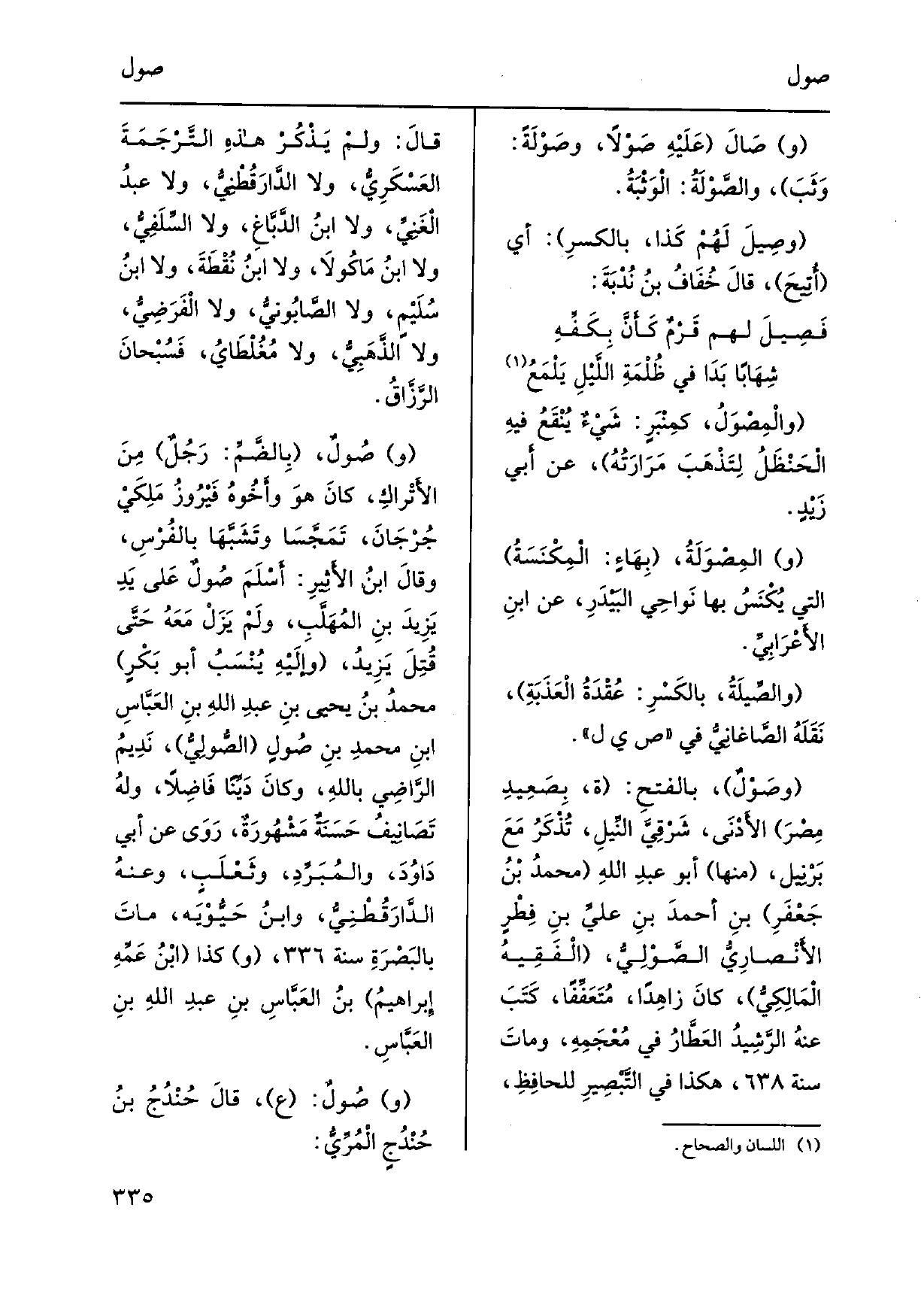 } والْمِصْوَلُ، كمِنْبَرٍ: شَيْءٌ يَنْقَعُ فيهِ الْحَنْظَلُ لِتَذْهَبَ مَرَارَتُهُ، عَن أَبي زَيْدٍ. (و) {المِصْوَلَةُ، بِهَاءٍ: المِكْنَسَةُ الَّتِي يُكْنَسُ بهَا نَواحِي البَيْدَرِ، عَن ابْن الأَعْرابِيِّ.} والصِّيلَةُ، بالكَسْرِ: عُقْدَةُ الْعَذَبَةِ، نَقَلَهُ الصّاغَانِيُّ فِي ص ي ل. {وصَوْلٌ، بالفَتحِ: ة، بِصَعِيدِ مِصْرَ الأَدْنَى، شَرْقِيَّ النِّيلِ، تُذْكَرُ مَعَ بَرْنِيل، مِنْهَا أَبُو عبد اللهِ محمدُ بنُ جَعْفَرِ بنِ أحمدَ بنِ عليِّ بنِ فِطْرٍ الأَنْصارِيُّ} - الصَّوْلِيُّ، الْفَقِيهُ الْمَالِكِيُّ، كانَ زاهِداً، مُتَعَفِّفاً، كَتَبَ عنهُ الرَّشِيدُ العَطَّارُ فِي مُعْجَمِهِ، وماَ سنة، هَكَذَا فِي التَّبْصِيرِ للحافِظِ، قالَ: لمْ يَذْكُرْ هَذِه التَّرْجَمَةَ العَسْكَرِيُّ، وَلَا الدَّارَقُطْنِيُّ، وَلَا عبدُ الْغَنِيِّ، وَلَا ابنُ الدَّبَّاغِ، وَلَا السِّلَفِيُّ، وَلَا ابنُ مَاكُولاَ، وَلَا بنُ نُقْطَةَ، وَلَا ابنُ سُلَيْمٍ، وَلَا الصَّابُونِيُّ، وَلَا الْفَرَضِيُّ، وَلَا الذَّهَبِيُّ، وَلَا مُغْلْطَاي، فسُبْحانَ الرَّزَّاقُ. (و) {صُولٌ، بِالضَّمِّ: رَجُلٌ مِنَ الأَتْراكِ، كانَ هوَ وأَخُوهُ) فَيْرُوزُ مَلِكَيْ جُرْجَانَ،، تَمَجَّسَا وتَشَبَّها بالفُرْسِ، وقالَ ابنُ الأَثِيرِ: أَسْلَمَ صُولٌ عَلى يَدِ يَزِيدَ بنِ المُهَلَّبِ، ولَمْ يَزَلْ مَعَهُ حَتَّى قُتِلَ يَزِيدُ، وإِلَيْهِ يُنْسَبُ أَبُو بَكْرٍ محمدُ بنُ يحيى بن عبد اللهِ بنِ العَبَّاسِ ابنِ مُحمدِ بنِ صُولٍ} - الصُّولِيُّ، نَدِيمُ الرَّاضِي باللهِ، وكانَ دَيِّناً فَاضِلاً، ولهُ تَصَانِيفُ حَسَنَةٌ مَشْهُورَةٌ، رَوَى عَن أبي دَاوُدَ، والمُبَرِّدَ، وثَعْلَبٍ، وعنهُ الدَّارَقُطْنِيُّ، وابنُ حَيُّوْيَه، ماتَ بالبَصْرَةِ سنة، وَكَذَا ابنُ عَمِّهِ إِبراهيمُ بنُ العَبَّاسِ بنِ عبد اللهِ بنِ العَبَّاسِ. وصُولٌ: ع، قالَ حُنْدُجُ بنُ حُنْدُجٍ الْمُرِّيُّ: