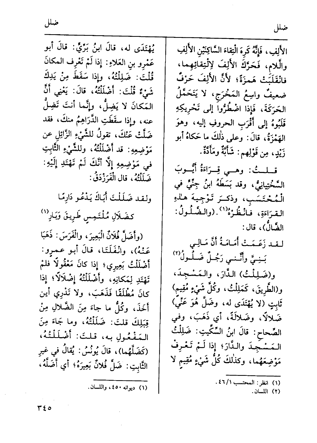 و} ضَلِلْتُ الدَّارَ، والمَسْجِدَ، والطَّرِيقَ، كَمَلِلْتُ، وكُلَّ شَيْءٍ مُقِيمٍ ثَابِتٍ لَا يُهْتَدَى لَهُ، {وضَلَّ هُوَ عَنِّيَ} ضَلالاً، {وضَلالَةً، أَي ذَهَبَ، وَفِي الصِّحاحِ: قالَ ابنُ السِّكِّيتِ:} ضَلِلْتُ المَسْجِدَ والدَّارَ، إِذا لَمْ تَعْرِفْ مَوْضِعَهُما، وكذلكَ كُلُّ شَيْءٍ مُقِيمٍ لَا يُهْتَدَى لَهُ، قالَ ابنُ بَرِّيٍّ: قالَ أَبُو عَمْرِو بنِ العَلاءِ: إِذا لَمْ تَعْرِف المكانَ قُلتَ: {ضَلِلْتُهُ، وَإِذا سَقَطَ مِنْ يَدِكَ شَيْءٌ قُلْتَ:} أَضْلَلْتُهُ، قالَ: يَعْنِي أَنَّ المَكانَ لَا {يَضِلُّ، وإِنَّما أنتَ} تَضِلُّ عَنهُ، وَإِذا سقَطَتِ الدَّرَاهِمُ منكَ، فقد {ضَلَّتْ عَنْكَ، تقولُ للشَّيْءِ الزائل فِي مَوضِعِهِ قد} أَضُلَلْتُهُ، وللشيء الثَّابِت فِي مَوْضِعه إلاَ أنّكَ لَمْ تَهْتَدِ إِلَيْهِ: {ضَلَلْتُهُ، قَالَ الْفَرَزْدَقُ: