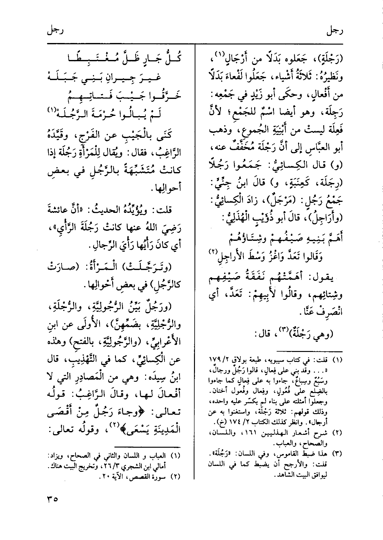 رَجْلَةٍ، جَعَلُوه بَدَلاً من أَرْجَالٍ، ونَظِيرُهُ: ثَلاثَةُ أَشْياء، جَعَلُوا لفعاءَ بَدَلاً من أَفْعالٍ، وحكَى أَبُو زَيْدٍ فِي جَمْعِه: رَجِلَة، وَهُوَ أَيْضا اسْمٌ للجَمْعِ، لأنَّ فَعِلَة ليستْ من أَبْنِيَةِ الجُمُوع، وَذهب أَبُو العبَّاسِ إِلَى أنَّ رَجْلَة مُخَفَّفٌ عَنهُ، وَقَالَ الكِسَائِيُّ: جَمَعُوا رَجُلاً رِجَلَة، كَعِنَبَةٍ، وقالَ ابنُ جِنِّيٍّ: جَمْعُ رَجُلٍ:) مَرْجَلٌ، زادَ الْكِسائِيُّ: وأَرَاجِلُ، قالَ أَبُو ذُؤَيْبٍ الْهُذَلِيُّ: