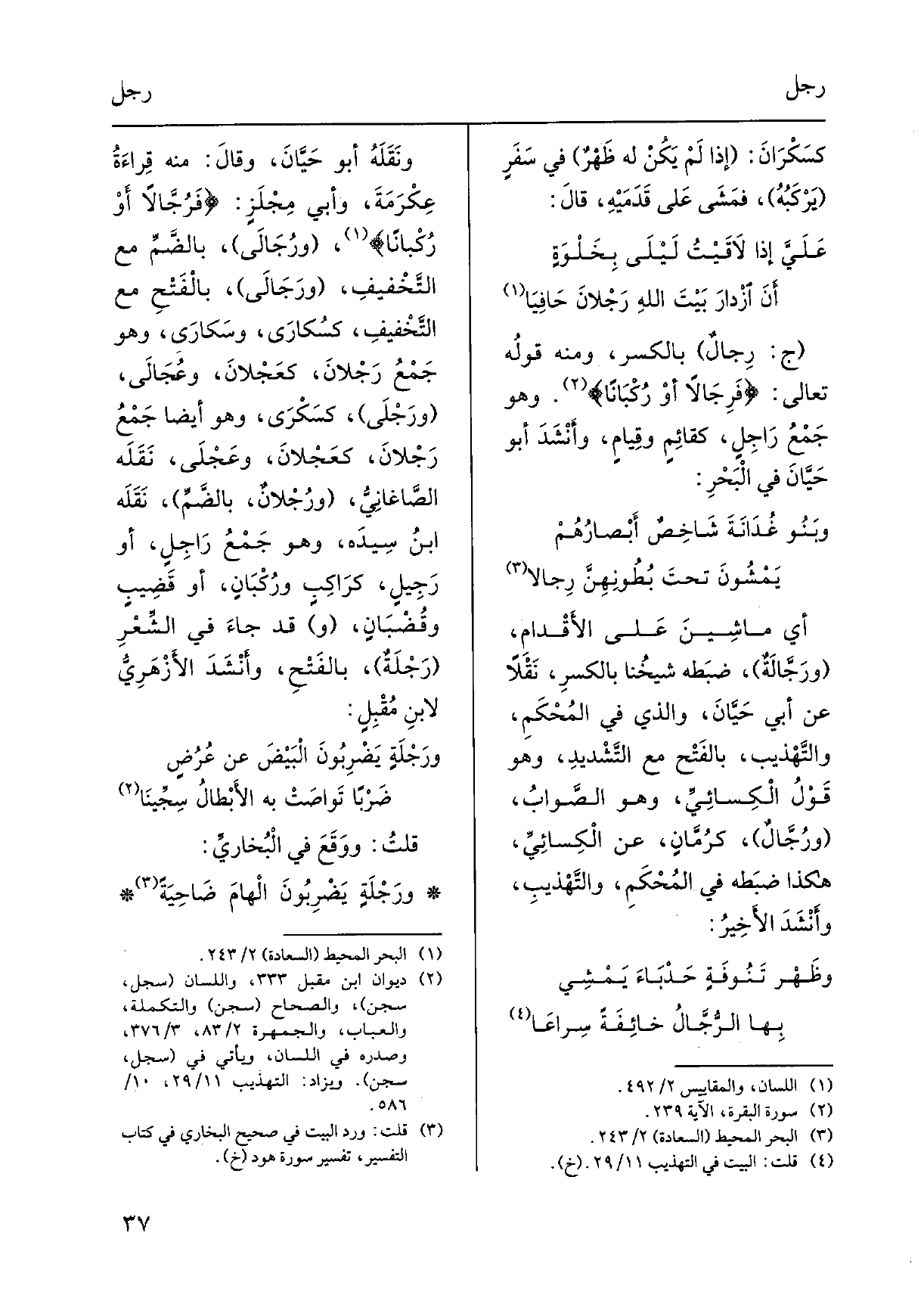 ونَقَلَهُ أَبُو حَيَّانَ، وقالَ: مِنْهُ قِراءَةُ عِكْرَمَةَ، وَأبي مِجْلزٍ: فرُجَّالاً أَوْ رُكْباناً، ورُجَالَى، بالضَّمِّ مَعَ التَّخْفِيفِ، ورَجَالَى، بالْفَتْحِ مَعَ التَّخْفِيف، كسُكارَى، وسَكارَى، وَهُوَ جَمْعُ رَجْلانَ، كعَجْلانَ، وعُجَالَى، ورَجْلَى، كسَكْرَى، وَهُوَ أَيضاً جَمْعُ رَجْلانَ، كعَجْلانَ، وعَجْلَى، نَقَله الصّاغَانِيُّ، ورُجْلانٌ، بالضَّمِّ، نَقَلَهُ ابنُ سِيدَه، وَهُوَ جَمْعُ رَاجِلٍ، أَو رَجِيلٍ، كرَاكِبٍ ورُكْبَانٍ، أَو قَضِيبٍ وقُضْبَانٍ، وَقد جاءَ فِي الشِّعْرِ رَجْلَةٌ، بالفَتْحِ، وأَنْشَدَ الأَزْهَرِيُّ لِابْنِ مُقْبِلٍ:
