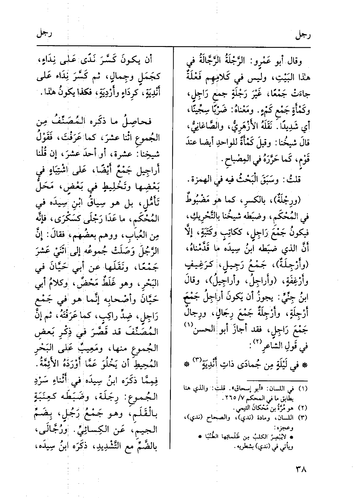 وَقَالَ أَبُو عَمْرٍ و: الرَّجْلَةُ الرَّجَّالَةُ فِي هَذَا البَيْتِ، وَلَيْسَ فِي كَلامِهِم فَعْلَةٌ جاءَتْ جَمْعاً، غَيْرَ رَجْلَةٍ جمع رَاجِلٍ، وكَمْأَةٍ جَمْعِ كَمْءٍ. ومَعْناهُ: ضَرْباً سجِّيناً، أَي شَدِيداً. نَقَلَهُ الأَزْهَرِيُّ، والصّاغَانِيُّ، قالَ شيخُنا: وقيلَ كَمْأَةٌ للواحدِ أَيْضا عندَ قَوْمٍ، كَما حَرَّرَهُ فِي المِصْباحِ. قلتُ: وسَبَقَ الْبَحْثُ فِيهِ فِي الْهمزَة. ورِجْلَةٌ، بالكسرِ، كَمَا هُوَ مَضْبُوطٌ فِي المُحْكَمِ، وضبَطه شيخُنا بالتَّحْرِيكِ، فيكونُ جَمْعَ رَاجِلٍ، ككاتِبٍ وكَتَبَةٍ، إلاَّ أَنَّ الَّذِي ضبَطَه ابنُ سِيدَه مَا قَدَّمْناهُ، وأَرْجِلَةٌ، جَمْعُ رَجِيلٍ، كرَغِيفٍ وأَرْغِفَةٍ، وأَراجِلُ، وأراجِيلُ، وقالَ ابنُ جِنِّيٍّ: يجوزُ أَن يَكُونَ اراجِلُ جَمْعَ) أَرْجِلَةٍ، وأَرْجِلَةٌ جَمْعَ رِجَالٍ، ورِجالٌ جَمْعَ رَاجِلٍ، فقد أجازَ أَبُو الْحسن فِي قَوْلِ الشاعرِ: فِي لَيْلَةٍ مِن جُمادَى ذاتِ أَنْدِيَةٍ أَن يكونَ كَسَّرَ نَدىً عَلى نِدَاءٍ، كجَمَلٍ وجِمالٍ، ثمَّ كَسَّرَ نِدَاء عَلى أَنْدِيَةٍ، كرِدَاءٍ وأَرْدِيَةٍ، فَكَذَا يكونُ هَذَا. فحاصِلُ مَا ذكَره المُصَنِّفُ من الجُموعِ اثْنا عشرَ، كَمَا عَرَفْتَ، فَقَوْلُ شيخِنا: عشرَة، أَو أحدَ عشرَ، إِن قُلْنا أَراجِيل جَمْعٌ أَيْضاً، عَلى اشْتِباهٍ فِي بَعْضِها وتَخْلِيطٍ فِي بَعْضٍ، مَحَلُّ تَأَمُّلٍ، بل هُوَ سِياقُ ابْنِ سِيدَه فِي المُحْكَمِ، مَا عَدَا رَجْلَى كسَكْرَى، فإنَّه مِن العُبَابِ، وَوهم بعضُهم، فقالَ: إِنَّ الرَّجُلَ وَصَلَتْ جُمُوعُه إِلَى اثنَيْ عَشرَ جَمْعاً، ونَقَلَها عَن أبي حَيَّانَ فِي البَحْرِ، وَهُوَ غَلَطٌ مَحْضٌ، وكلامُ أبي حَيَّانَ وأصْحابِه إنَّما هُوَ فِي جَمْع رَاجِلٍ، ضِدِّ راكِبٍ، كَمَا عَرَفْتَهُ، ثمَّ إنَّ المُصَنِّفَ قد قَصَّرَ فِي ذِكْرِ بَعْضِ الجُموعِ مِنْهَا، ومَعِيبٌ عَلى البَحْرِ المُحِيطِ أَن يَخْلُوَ عَمَّا أَوْرَدَهُ الأَئِمَّةُ. فمِمَّا ذكَرَه ابنُ سِيدَه فِي أَثْناءِ سَرْدِ الجُموعِ: رِجَلَة، وضَبَطَه كعِنَبَةٍ بالْقَلَمِ، وَهُوَ جَمْعُ رَجُلٍ، بِضَمَّ الجيمِ، عَن الكِسائِيِّ، ورُجَّالَى، بالضَّمَّ مَعَ التَّشْدِيدِ، ذكَرَهُ ابنُ سِيدَه،