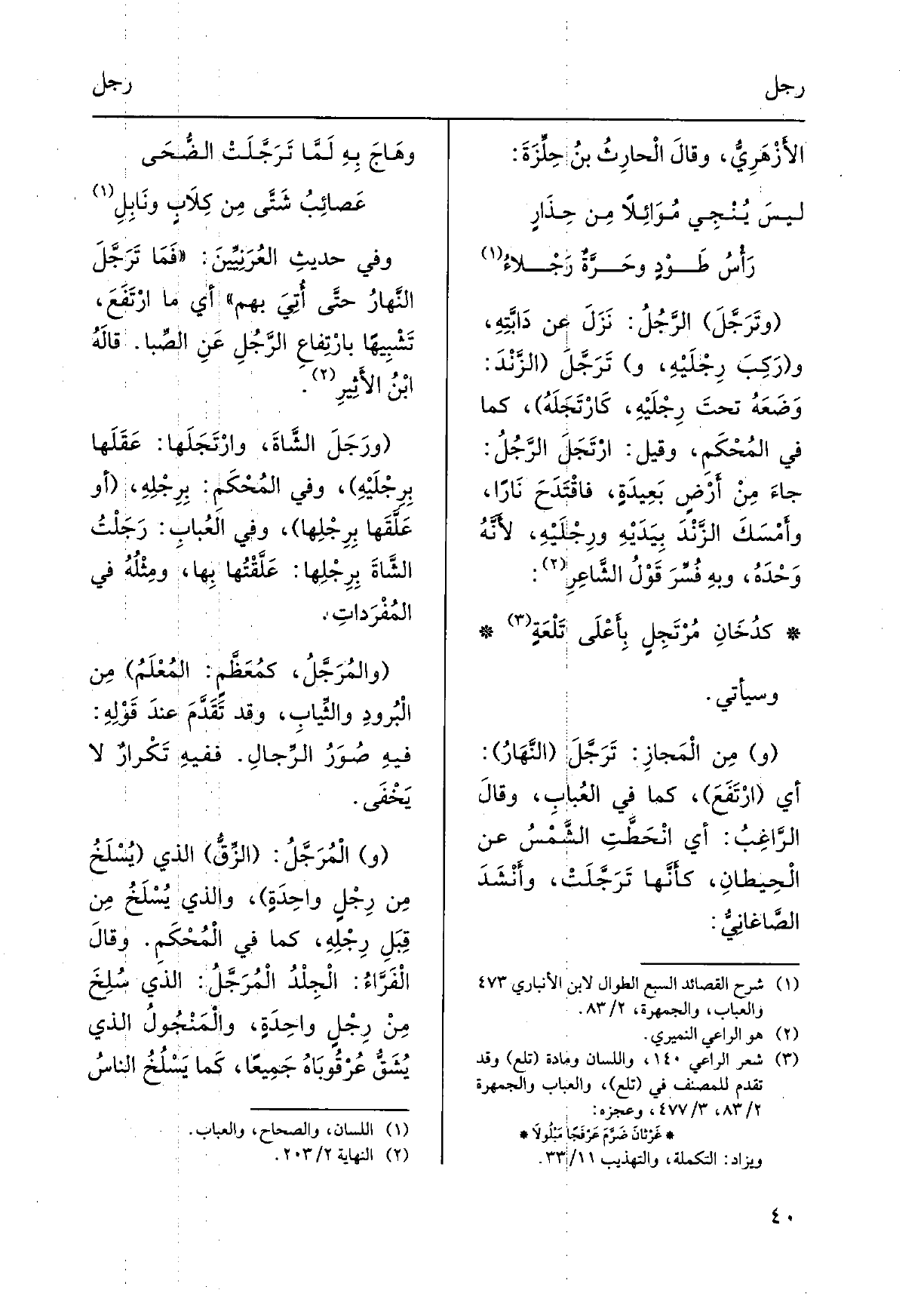 وَفِي حدِيثِ العُرَنِيِّينَ: فَمَا تَرَجَّلَ النَّهارُ حتَّى أُتِيَ بهم أَي مَا ارْتَفَعَ، تَشْبِيهاً بارْتِفاعِ الرَّجُلِ عَنِ الصِّبا. قالَهُ ابْنُ الأَثِيرِ. ورَجَلَ الشَّاةَ، وارْتَجَلها: عَقَلها بِرِجْلَيْهِ، وَفِي المُحْكَمِ: بِرِجْلِهِ، أَو عَلَّقَها بِرِجْلِها، وَفِي العُبابِ: رَجَلْتُ الشَّاةَ بِرِجْلِها: عَلَّقْتُها بِها، ومِثْلُهُ فِي المُفْرَداتِ. والمُرَجَّلُ، كمُعَظَّم: المُعْلَمُ مِن الْبُرودِ والثِّيابِ، وَقد تَقَدَّمَ عندَ قَوْلِهِ: فيهِ صُوَرُ الرِّجالِ. ففيهِ تَكْرارٌ لَا يَخْفَى.