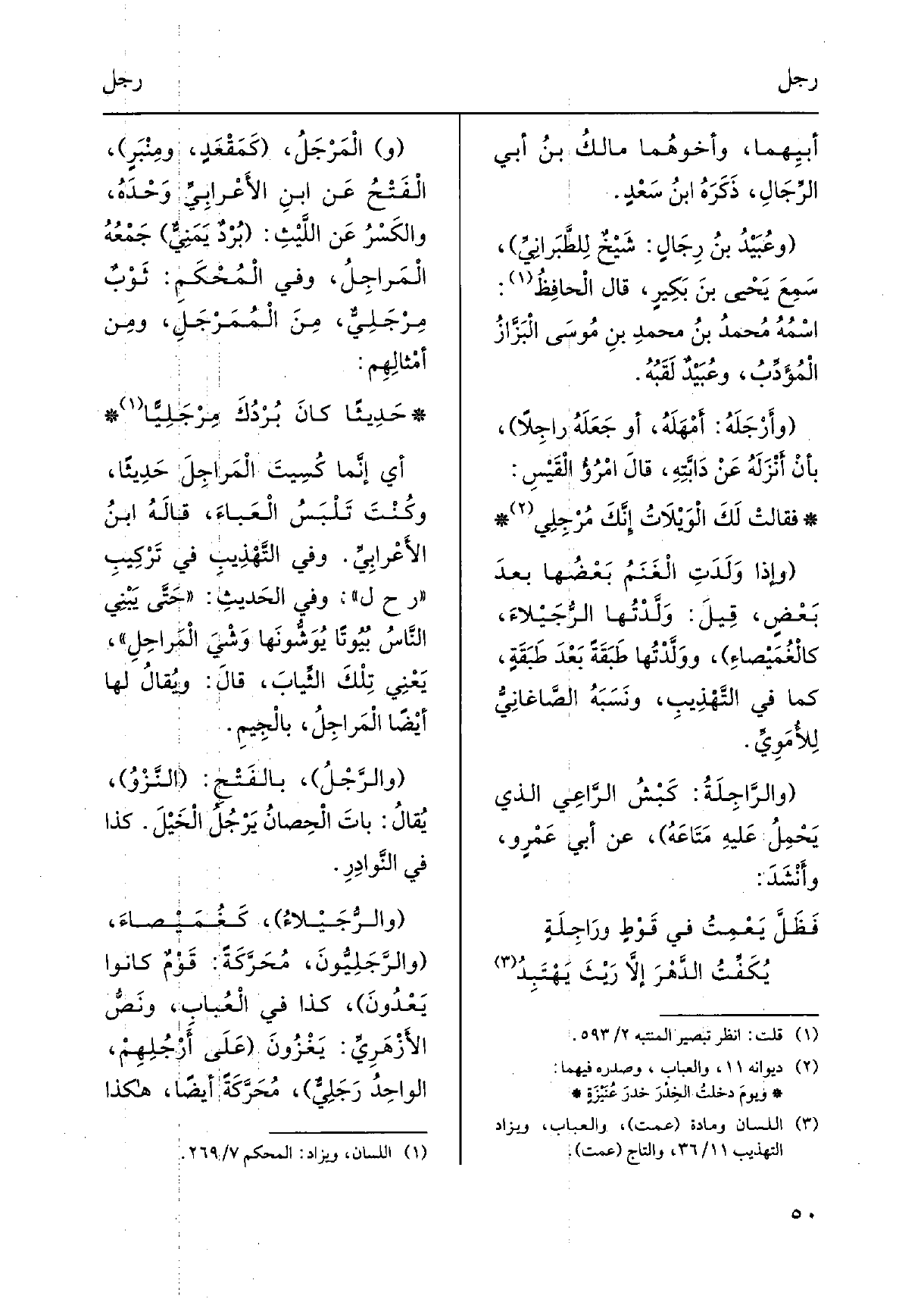 وعُبَيْدُ بنُ رِجَالٍ: شَيْخٌ لِلطَّبَرانِيِّ، وسَمِعَ يَحْيى بنَ بَكِيرٍ، قَالَ الْحافِظُ: اسْمُهُ مُحمدُ بنُ محمدِ بنِ مُوسَى الْبَزَّازُ الْمُؤَدِّبُ، وعُبَيْدٌ لَقَبُهُ. وأَرْجَلَهُ: أمْهَلَهُ، أَو جَعَلَهُ راجِلاً، بأنْ أنْزَلَهُ عَنْ دَابَّتِهِ، قالَ امْرُؤُ الْقَيْسِ: فقالتْ لَكَ الْوَيْلاَتُ إِنَّكَ مُرْجِلِي وَإِذا وَلَدَتِ الْغَنَمُ بَعضُها بعدَ بَعْضٍ، قِيلَ: وَلدْتُها الرُّجَيْلاءَ، كالْغُمَيْصاءِ، ووَلَّدْتُها طَبقَةً بَعْدَ طَبَقَةٍ، كَمَا فِي التّهْذِيبِ، ونَسَبَهُ الصّاغَانِيُّ للأُمَوِيِّ. والرَّاجِلَةُ: كَبْشُ الرَّاعِي الَّذِي يَحْمِلُ عَلَيهِ مَتَاعَهُ، عَن أبي عَمْرٍ و، وأَنْشَدَ: