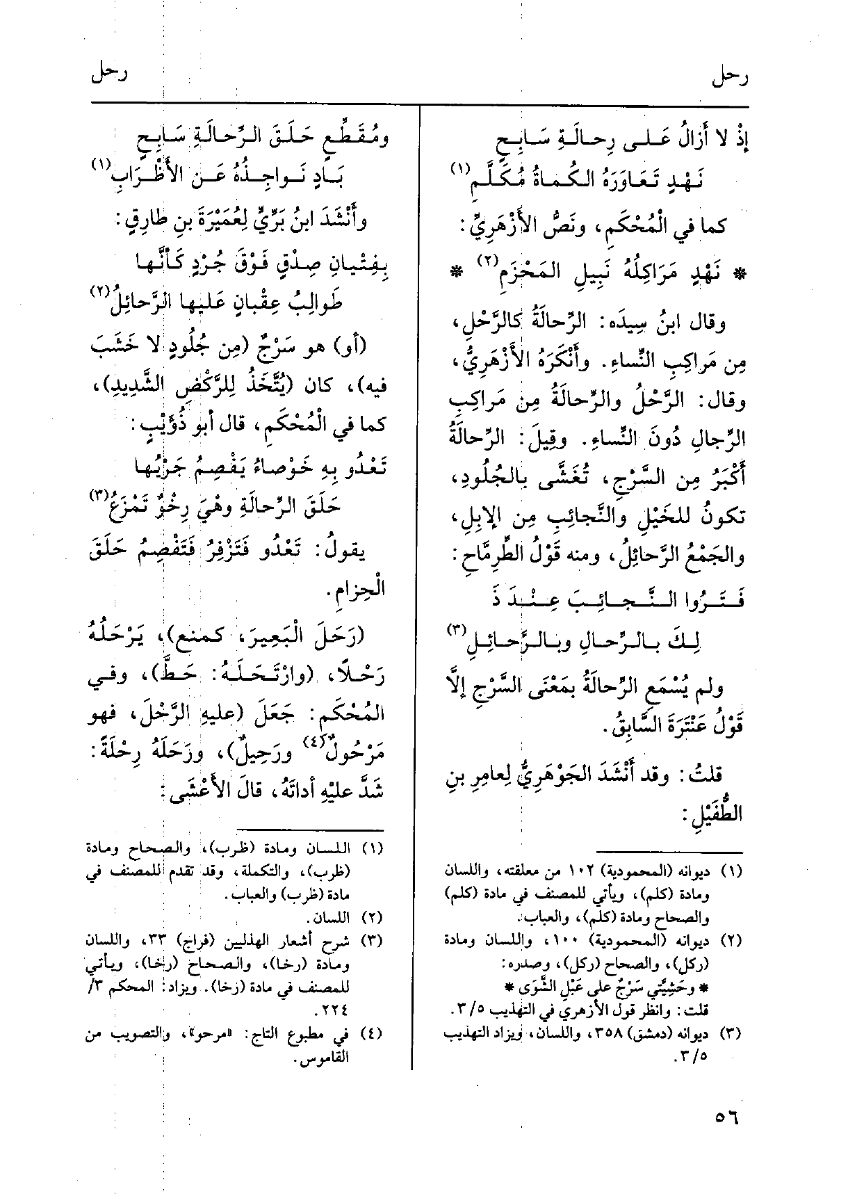 كَمَا فِي الْمُحْكَمِ، ونَصُّ الأَزْهَرِيُّ: نَهْدٍ مَرَاكِلُهُ نَبِيلِ المَحْزَمِ وَقَالَ ابنُ سِيدَه: الرِّحالَةُ كالرَِّحْلِ، مِن مَراكِبِ النِّساءِ. وأَنْكَرَهُ الأَزْهَرِيُّ، وَقَالَ: الرَّحْلُ والرِّحالَةُ) مِن مَراكِبِ الرِّجالِ دُونَ النِّساءِ. وقِيلَ: الرِّحالَةُ أَكْبَُ مِن السَّرْجِ، تُغَشَّى بالجُلُودِ، تكونُ للخَيْلِ، والنَّجائِبِ مِن الإِبِلِ، والجَمْعُ الرَّحائِلُ، وَمِنْه قَوْلُ الطِّرِمَّاحِ: