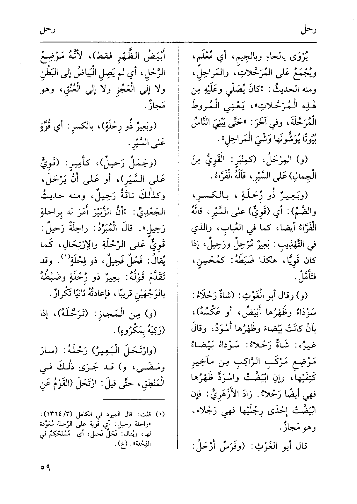 وجَمَلٌ رَحِيلٌ، كأَمِيرٍ: قَوِيٌّ عَلى السَّيْرِ، أَو عَلىَنْ يَرْحَلَ، وكذلكَ ناقَةٌ رَحِيلٌ، وَمِنْه حديثُ الجَعْدِيِّ: أنَّ الزُّبَيْرَ أمَرَ لَهُ بِراحِلةٍ رَحِيلٍ. قالَ الْمُبَرِّدُ: راحِلَةٌ رَحِيلٌ: قَوِيٌّ عَلى الرَّحْلَةِ والارْتِحَالِ، كَما يُقالُ: فَحْلٌ فَحِيلٌ، ذُو فِحْلَةٍ. قد تقَدَّمَ قَوْلُهُ: بعِيْرٌ ذُو رُحْلَةٍ وضبْطُهُ بالوَجْهَيْنِ قَرِيبا، فإعادتُهُ ثانِياً تَكْرارٌ. ومِن الْمَجازِ: تَرَحَّلَهُ، إِذا رَكبَهُ بِمَكْرُوهٍ. وارْتَحَلَ الْبَعِيرُ رَحْلَهُ: سارَ ومَضَى، وَقد جَرَى ذلكَ فِي الْمَنْطِقِ، حتَّى قيلَ: ارْتَحَلَ القَوْمُ عَنِ
