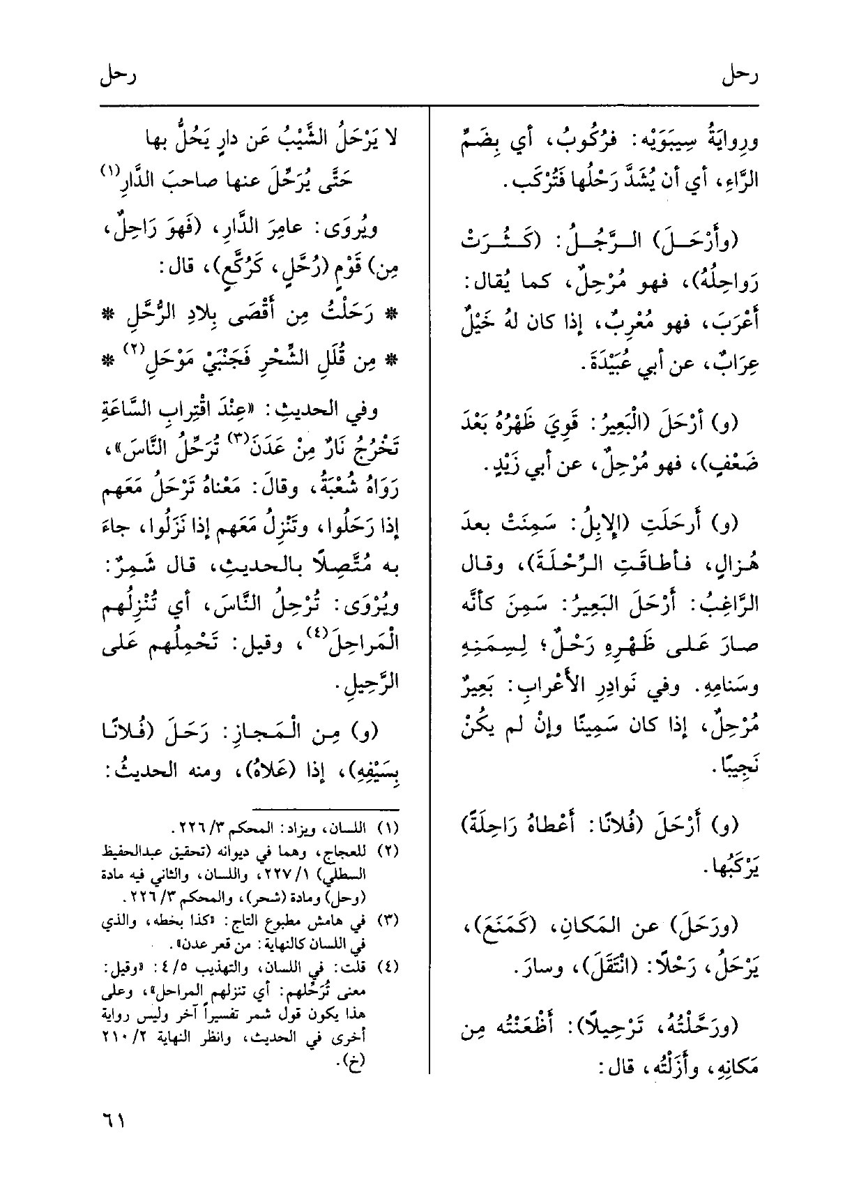 ويُروَى: عامِرَ الدَّارِ، فَهوَ رَاحلٌ، مِن قَوْمٍ رُحَّلٍ، كَرُكَّعٍ، قَالَ: رَحَلْتُ مِن أَقْصَى بِلادِ الرُّحَّلِ مِن قُلَلِ الشِّحْرِ فَجَنْبَيْ مَوْحَلِ وَفِي الحديثِ: عِنْدَ اقْتِرابِ السَّاعِةِ تَخْرُجُ نَارٌ مِنْ عَدَنَ تُرَحِّلُ النَّاسَ، رَواهُ شُعْبَةُ، وقالَ: مَعْناهُ تَرْحَلُ مَعْهم إِذا رَحَلُ، وتَنْزِلُ مَعَهم إِذا نَزَلُوا، جاءَ بِهِ مُتَّصِلاً بالحديثِ، قَالَ شَمِرٌ: ويُرْوَى: تُرْحِلُ النَّاسَ، أَي تُنْزِلُهم الْمَراحِلَ، وَقيل: تَحْمِلُهم عَلى الرَّحِيلِ. ومِن الْمَجازِ: رَحَلَ فُلاناً بِسَيْفِهِ، إِذا عَلاهُ، وَمِنْه الحديثُ:
