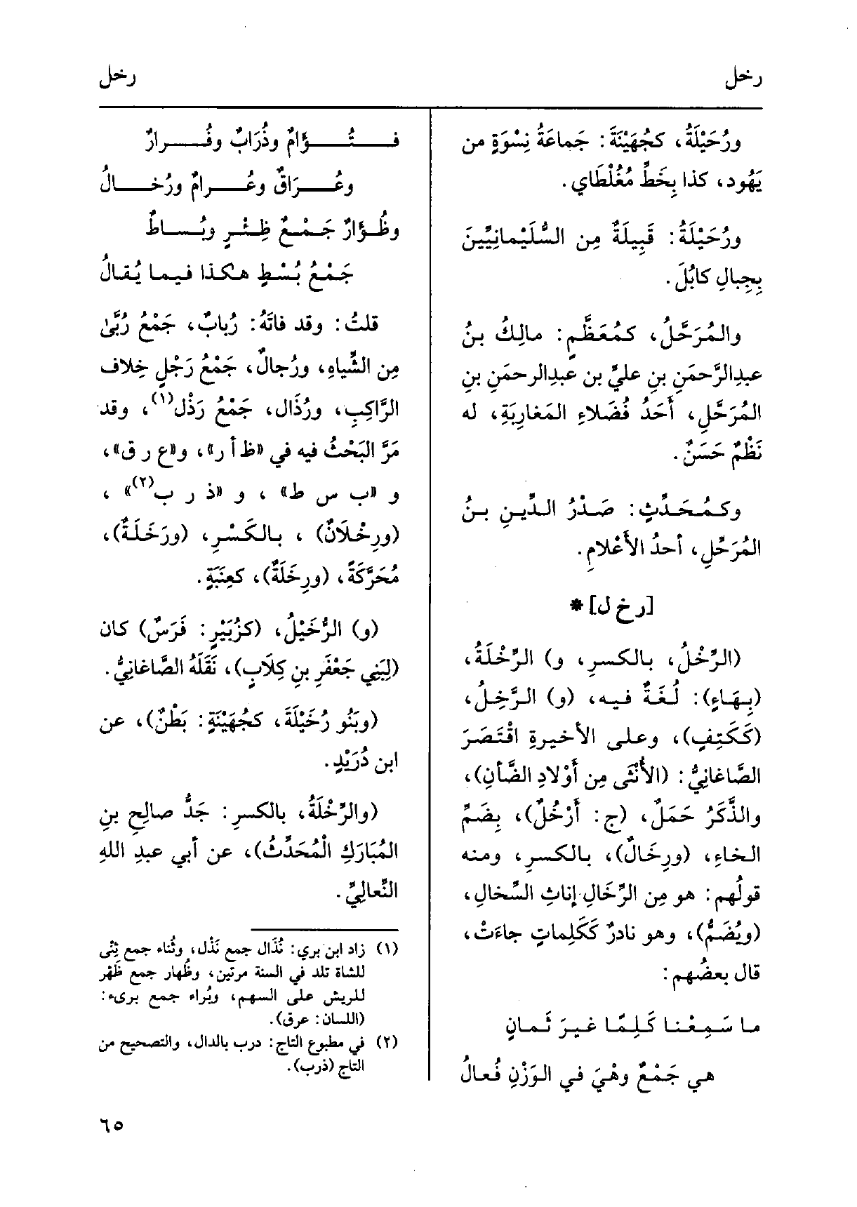 قلتُ: وَقد فاتَهُ: رُبابٌ، جَمْعُ رُبَّى مِن الشِّياهِ، ورُجالٌ، جَمْعُ رَجْلٍ خِلاف الرَّاكِبِ، ورُذَال، جَمْعُ رَذْل، وَقد مَرَّ البَحْثُ فِيهِ فِي ظ أر، وع ر ق، وب س ط، وذ ر ب، ورِخْلاَنٌ، بالكَسْرِ، ورَخَلَةٌ، مُحَرَّكَةً، ورِخَلَةٌ، كعِنَبَةٍ. والرُّخَيْلُ، كزُبَيْرٍ: فَرَسٌ كَانَ لِبَنِي جَعْفَرِ بنِ كِلاَبٍ، نَقَلَهُ الصّاغَانِيُّ. وبَنُو رُخَيْلَةَ، كجُهَيْنَةٍ: بَطْنٌ، عَن ابْن دُرَيْدٍ. والرِّخْلَةُ، بالكسرِ: جَدُّ صالِحِ بنِ المُبَارَكِ الْمُحَدِّثُ، عَن أبي عبدِ اللهِ النِّعالِيِّ.