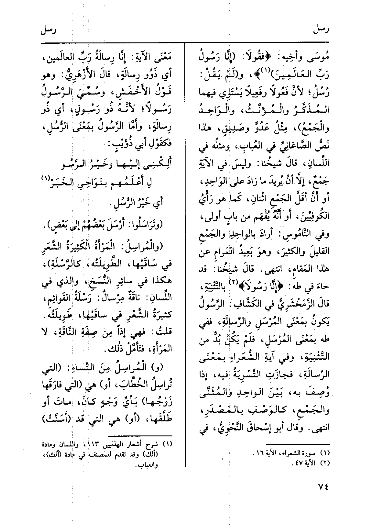 مُوسَى وأخِيه: فَقُولاَ: إِنَّا رَسُولُ رَبِّ العَالَمِينَ، ولَمْ يَقُلْ: رُسُلُ، لأنَّ فَعُولاً وفَعِيلاً يَسْتَوِي فيهمَا المُذَكَّرُ والْمُؤَنَّثُ، والْواحِدُ والْجَمْعُ، مِثْلُ عَدُوٍّ وصَدِيقٍ، هَذَا نَصُّ الصّاغَانِيُّ فِي العُبابِ، ومثلُه فِي اللِّسانِ، قالَ شيخُنا: وليسَ فِي الآيةِ جَمْعٌ، إلاَّ أنْ يُريدَ مَا زادَ على الواحِدِ، أَو أَنَّ أَقَلَّ الجَمْعِ اثْنانِ، كَما ورَأْيُ الكُوفِيِّينَ، أَو أَنَّهُ يُفْهَم من بابٍ أولى، وَفِي النَّامُوسِ: أرادَ بالواحِدِ والجَمْعِ القليلَ والكثيرَ، وهوَ بَعِيدُ المَرامِ عَن هَذَا المَقامِ، انْتهى. قالَ شيخُنا: قد جاءَ فِي طه: إِنَّا رَسُولاَ بالتَّثْنِيَةِ، قالَ الزَّمَخْشَرِيُّ فِي الكَشَّافِ: الرَّسُولُ يَكُونُ بِمَعْنَى المُرْسَلِ والرِّسالَةِ، فَفِي طه بِمعْنَى المُرْسَلِ، فلَمْ يَكُنْ بُدٌّ من التَّثْنِيَةِ، وَفِي آيةِ الشُّعَراءِ بمَعْنَى الرِّسالَةِ، فجازَتِ التَّسْوِيةُ فِيهِ، إِذا وُصِفَ بِهِ، بَيْنَ الواحِدِ والمُثَنَّى والجَمْعِ، كالوَصْفِ بالمَصْدَرِ، انْتهى. وَقَالَ أَبُو إسْحاقَ النَّحْوِيُّ، فِي مَعْنَى الآيةِ: إِنَّا رِسالَةُ رَبِّ العالَمِين، أَي ذَوُو رِسالَةٍ، قَالَ الأَزْهَرِيُّ: وَهُوَ قَوْلُ الأَخْفَشِ، وسُمِّيَ الرَّسُولُ رَسُولاً، لأنَّهُ ذُو رِسالَةٍ، وأَمَّا الرَّسُولُ بمَعْنَى الرُّسُلِ، فكقَوْلِ أبي ذُؤَيْبٍ: