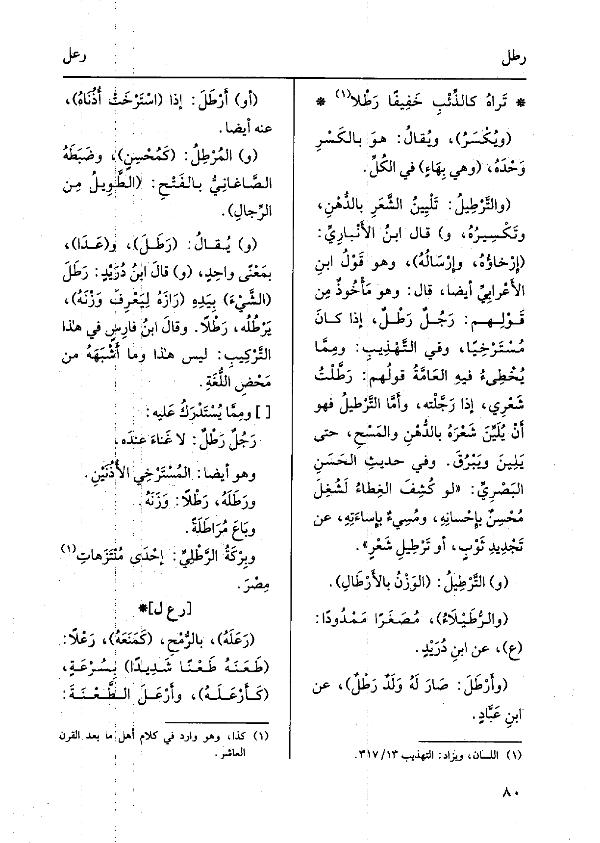 تَراهُ كالذِّئْبِ خَفِيفاً رَطلا ويُكْسَرُ، ويُقالُ: هوَ بالكَسْرِ وَحْدَهُ، وَهِي بِهَاءٍ فِي الكُلِّ. والتَّرْطِيلُ: تَلْيِينُ الشَّعَرِ بالدُّهْنِ، وتَكْسِيرُه، وَقَالَ ابنُ الأَنْبارِي: إِرْخاؤُهُ، وإِرْسَالُهُ، وَهُوَ قَوْلُ ابنِ الأَعْرابِيِّ أَيْضا، قَالَ: وَهُوَ مَأْخُوذٌ مِن قَوْلِهم: رَجُلٌ رَطْلٌ، إِذا كانَ مُسْتَرْخِياً، وَفِي التَّهْذِيبِ: ومِمَّا يُخْطِئُ فيهِ العَامّةُ قولُهم: رَطَّلْتُ شَعْرِي، إِذا رَجَّلْته، وأَمَّا التَّرْطيلُ فَهُوَ أَنْ يُلَيِّنَ شَعْرَهُ بالدُّهْنِ والمَسْحِ، حَتَّى يَلِينَ ويَبْرُقَ.