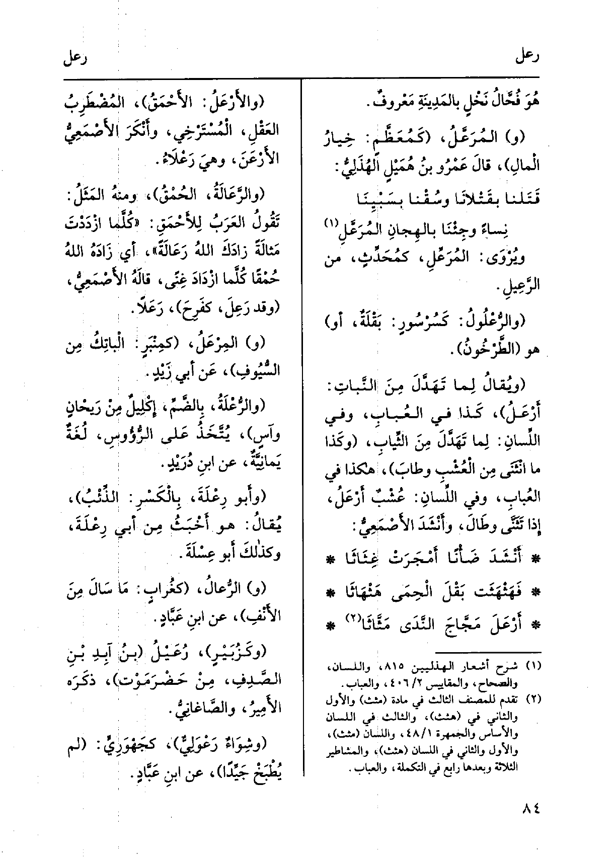 ويُرْوَى: المُرَعِّلِ، كمُحَدِّثٍ، من الرَّعِيلِ. والرُّعْلُول: كَسُرْسُورٍ: بَقْلَةٌ، أَو هُوَ الطَّرْخُونُ. ويُقالُ لِما تَهَدَّلَ مِنَ النَّباتِ: أَرْعَلُ، كَذا فِي العُبابِ، وَفِي اللِّسانِ: لِما تَهَدَّلَ مَنَ الثِّيابِ، وكَذا مَا انْثَنَى مِن الْعُشْبِ وطابَ، هَكَذَا فِي العُبابِ، وَفِي اللِّسانِ: عُشْبٌ أَرْعَلُ، إِذا تَثَنَّى وطَالَ، وأَنْشَدَ الأَصْمَعِيُّ: أَنْشَدَ ضَأْناً أَمْجَرَتْ غِثَاثَا فَهَثْهَثَت بَقْلَ الْحِمَى هَثْهَاثَا أَرْعَلَ مَجَّاجَ النَّدَى مَثَّانَا والأَرْعَلُ: الأَحْمَقُ، المُضْطَرِبُ العَقْلِ، الْمُسْتَرْخي، وأَنْكَرَ الأَصْمَعِيُّ الأَرْعَنَ، وهيَ رَعْلاَءُ.