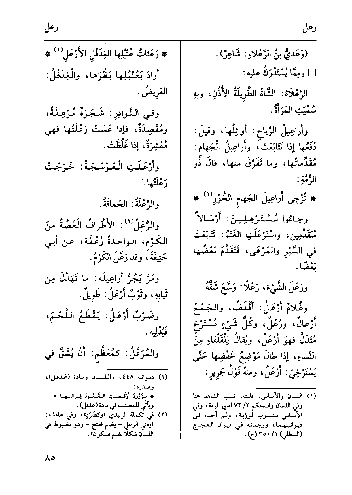 وعَديُّ بنُ الرَّعْلاءِ: شَاعِرٌ. وممّا يُسْتَدْرَكُ عَلَيْهِ: الرَّعْلاءُ: الشَّاةُ الطَّوِيلَةُ الأذُنِ، وبهِ سُمِّيَتِ المَرْأَةُ. وأَراعِيلُ الرِّياحِ: أَوائِلُها، وقيلَ: دُفَعُها إِذا تَتَابَعَتْ، وأَراعِيلُ الْجَهامِ: مُقَدِّماتُها، وَمَا تَفَرَّقَ مِنْهَا، قالَ ذُو الرُّمَّةِ: تُزْجِى أَراعِيلَ الجَهامِ الخُوْرِ وجاءُوا مُسْتَرْعِلِينَ: أَرْسَالاً مُتَقَدِّمِين، واسْتَرْعَلَتِ الغَنَمُ: تَتَابَعَتْ فِي السَّيْرِ والمَرْعَى، فَتَقَدَّمَ بَعْضُها بَعْضاً. ورَعَلَ الشَّيْءَ، رَعْلاً: وَسَّعَ شَقَّهُ. وغُلامٌ أَرْعَلُ: أَقْلَفُ، والجَمْعُ أَرْعالٌ، ورُعْلٌ، وكُلُّ شَيْءٍ مُسْتَرْخٍ مُتَدَلٍّ فهوَ أَرْعَلُ، ويُقالُ لِلْقَلْفاءِ مِنَ النِّساءِ، إِذا طالَ مَوْضِعُ خَفْضِها حَتَّى يَسْتَرْخِيَ: أَرْعَلُ، ومنهُ قَوْلُ جَرِيرٍ:) رَعَثاتُ عُنْبُلِها الغِدَفْلِ الأَرْعَلِ أرادَ بَعُنبُلِها بَظْرَها، والْغِدْفْلُ العَرِيضُ. وَفِي النَّوادِرِ: شَجَرَةٌ مُرْعِلَةٌ، ومُقْصِدَةٌ، فَإِذا عَسَتْ رَعْلَتُها فَهِيَ مُمْشِرَةٌ، إِذا غَلُظَتْ. وأَرْعَلَتِ الْعَوْسَجَةُ: خَرَجَتْ رَعْلَتُها. والرَّعْلَةُ: الحَماقَةُ.