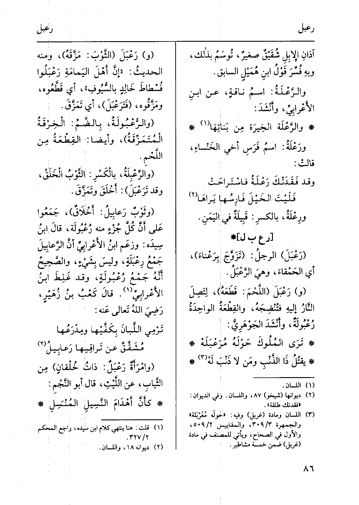 رَعْبَلَ الرَّجُل: تَزَوَّجَ بِرَعْناءَ، أَي الحَمْقاءَ، وهيَ الرَّعْبَلُ. ورَعْبَلَ اللَّحْمَ: قَطَعَهُ، لِتَصِلَ النَّارُ إليهِ فتُنْضِجَهُ، والقِطْعَةُ الواحِدَةُ رُعْبُولَةٌ، وأَنْشِدَ الجَوْهَرِيّ: تَرَى المُلُوكَ حَوْلَهُ مُرَعْبَلَه يقتُلُ ذَا الذَّنْبِ ومَن لَا ذَنْبَ لَهُ ورَعْبَلَ الثَّوْبَ: مَزَّقَهُ، وَمِنْه الحديثُ: إنَّ أَهْلَ اليَمامَةِ رَعْبَلُوا فُسْطاطَ خالِدٍ بالسُّيُوفِ، أَي قَطَّعُوه، ومَزّقُوه، فَتَرَعْبَلَ، أَي تَمَزَّقَ. والرُّعْبُولَةُ، بِالضَّمِّ: الْخِرْقَةُ الْمُتَمَزِّقةُ، وأيضَاً: القِطْعَةُ مِن اللَّحْمِ. والرِّعْبِلَةُ، بالْكَسْرِ: الثَّوْبُ الْخَلَقُ، وَقد تَرَعْبَلَ: أَخْلَقَ وتَمَزَّقَ. وثَوْبٌ رَعابِيلُ: أَخْلاَقٌ، جَمَعُوا عَلى أَنَّ كُلَّ جُزْءٍ مِنْهُ رُعْبُولَة، قالَ ابنُ سِيدَه: وزَعم ابنُ الأَعْرابِيِّ أنَّ الرَّعابِيلَ جَمْعُ رِعْبَلَةٍ، وليسَ بِشَيٍْْ، والصَّحِيحُ أنَّه جَمْعُ رُعْبُولَةٍ، وَقد غَلِطَ ابنُ الأَعْرابِيِّ. قالَ كَعْبُ بنُ زُهَيْرٍ، رَضِيَ اللهُ تَعالى عَنْه:
