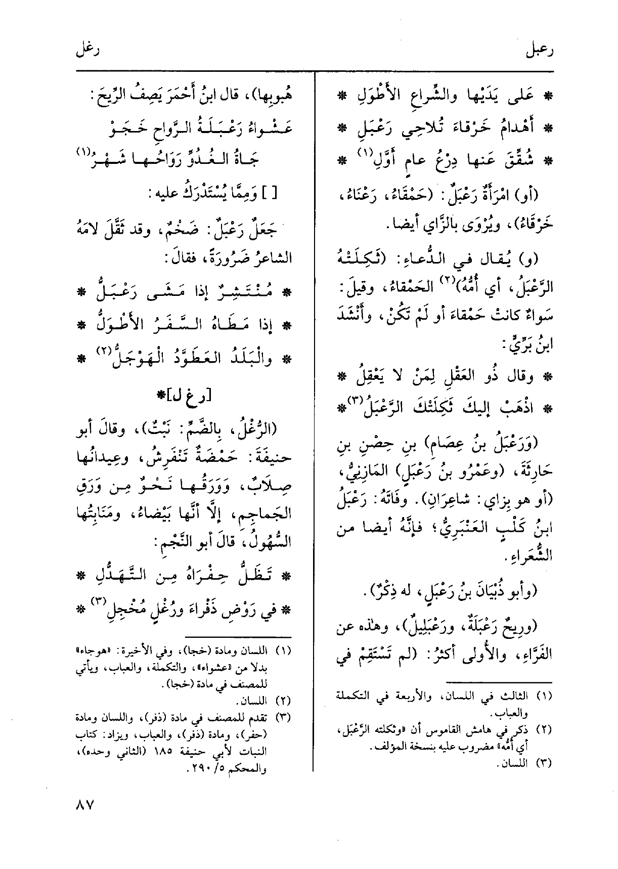 عَلى يَدَيْها والشِّرَاعِ الأَطْوَلِ أَهْدامُ خَرْقاءَ تُلاحِي رَعْبَلِ شُقِّقَ عَنها دِْعُ عامٍ أَوَّلِ أَو امْرأَةٌ رَعْبَلٌ: حَمْقَاءُ، رَعْنَاءُ، خَرْقَاءُ، ويُرْوَى بالزَّاي أَيْضا. ويُقال فِي الدُّعاءِ: ثَكِلَتْهُ الرَّعْبَلُ، أَي أُمِّهُ، الحَمْقَاءُ، وقيلَ: سَواءٌ كانتْ حَمْقاءَ أَو لم تَكُنْ، وأَنْشَدَ ابنُ بَرِّيٍّ: وَقَالَ ذُو العَقْلِ لِمَنْ لَا يَعْقِلُ اذْهَبْ إليكَ ثَكِلَتْكَ الرَّعْبَلُ وَرَعْبَلُ بنُ عِصَامِ بنِ حِصْنِ بنِ حَارِثَةَ، وعَمْرُو بنُ رَعْبَلٍ المَازِنِيُّ، أَو هُوَ بِزاي: شاعِرَانِ.