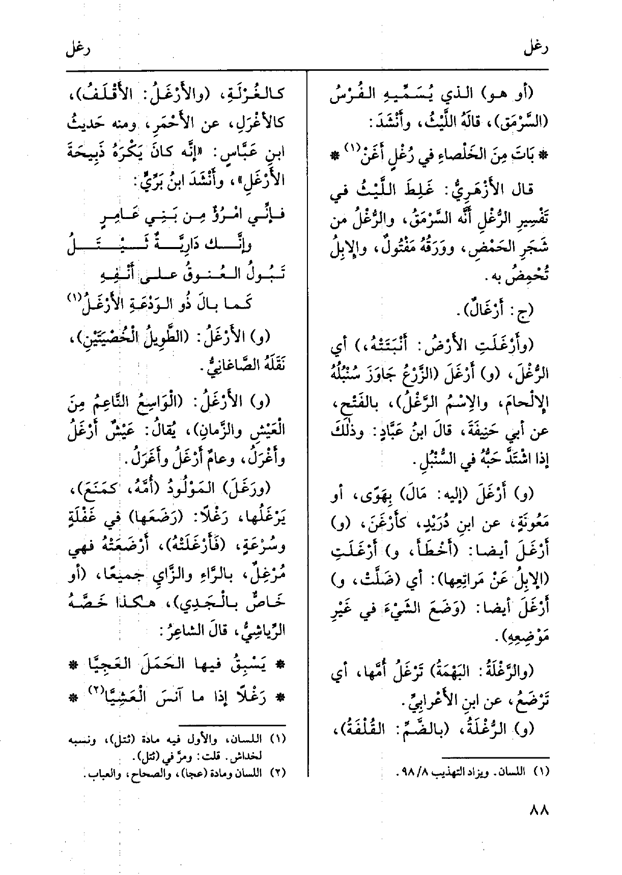 أَو هُوَ الَّذِي يُسَمِّيهِ الفُرْسُ السَّرْمَق، قالَهُ اللِّيْثُ، وأَنْشَدَ: بَاتَ مِنَ الخَلْصاءِ فِي رُغْلٍ أَغَنْ قَالَ الأَزْهَرِيُّ: غَلِطَ اللَّيْثُ فِي تَفْسِيرِ الرُّغْلِ أَنَّه السَّرْمَقُ، والرُّغْلُ من شَجَرِ الحَمْضِ، ووَرَقُهُ مَفْتُولٌ، والإِبِلُ تُحْمِضُ بِهِ. ج: أَرْغَالٌ. وأَرْغَلَتِ الأَرْضُ أَنْبَتَتْهُ، أَي الرُّغْلَ، وأَرْغَلَ الزَّرْعُ جَاوَزَ سُنْبُلُ الإِلْحامَ، والاسْمُ الرَّغْلُ، بالفَتْحِ، عَن أبي حَنِيفَةَ، قالَ ابنُ عَبَّادٍ: وذلكَ إِذا اشْتَدَّ حُبُّهُ فِي السُّنْبُلِ. وأَرْغَلَ إِلَيْهِ: مَالَ بِهَوىً، أَو مَعُونَةٍ، عَن ابنِ دُرَيْدٍ، كأَرْغَنَ، وأَرغَلَ أَيْضاً: أَخْطَأَ، وأَرْغَلَتِ الإِبِلُ عَنْ مَراتِعِها: أَي ضَلَّتْ، وأَرْغَلَ أَيْضا: وَضَع الشّيْءَ فِي غَيْرِ مَوْضِعِه.