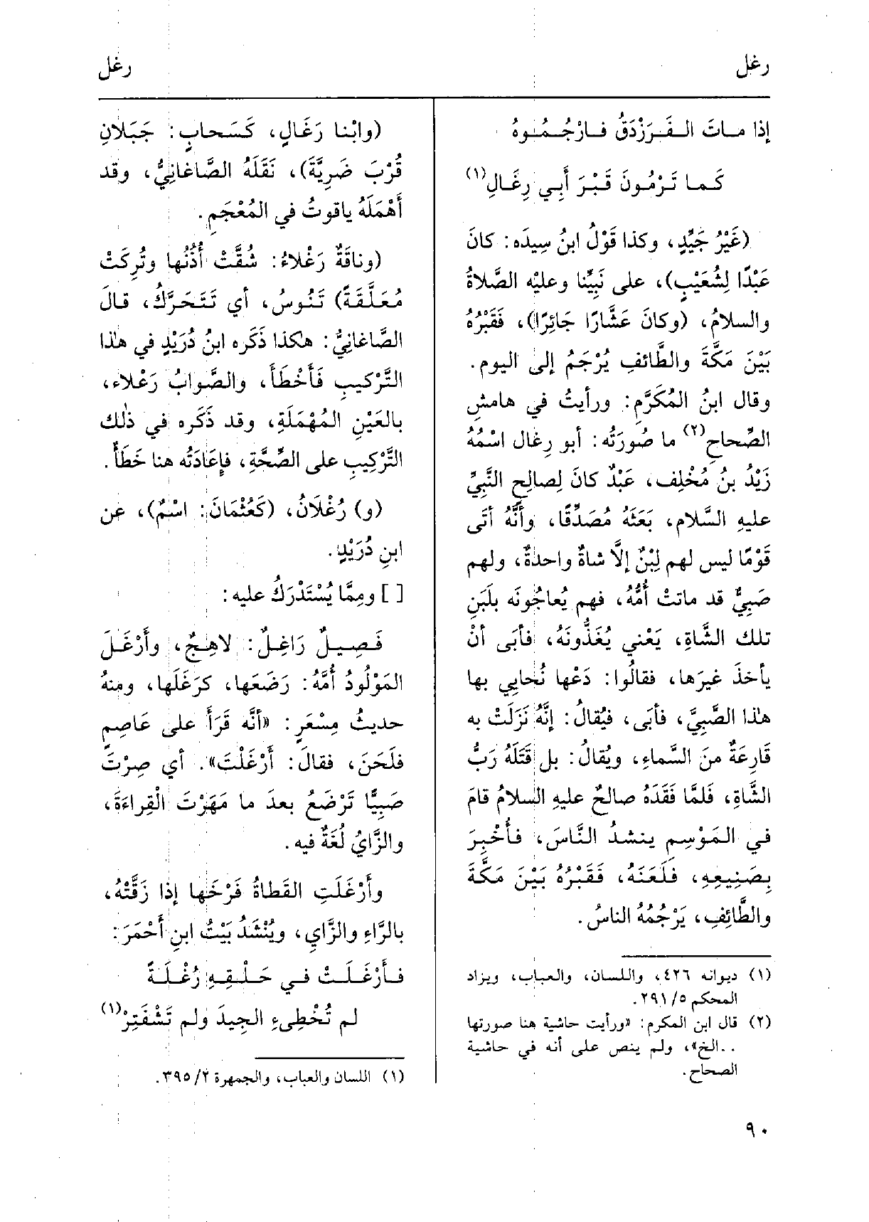 غَيْرُ جَيِّدٍ، وَكَذَا قَوْلُ ابنُ سِيدَه: كانَ عَبْداً لِشُعَيْبٍ، على نَبِيِّنا وعَلَيْه الصَّلاةُ والسّلامُ، وكانَ عَشَّاراً جَائِراً، فَقَبْرُهُ بَيْنَ مَكَّةَ والطَّائفِ يُرْجَمُ إِلَى الْيَوْم. وَقَالَ ابنُ المُكَرَّمِ: ورأيتُ فِي هامِشِ الصِّحاحِ مَا صُورَتُه: أَبُو رِغال اسْمُهُ زَيْدُ بنُ مُخْلِف، عَبْدٌ كانَ لِصالِحٍ النّبِيِّ عليهِ السِّلامِ، بَعَثَهُ مُصَدِّقاً، وأنَّهُ أتَى قَوْماً لَيْسَ لَهُم لِبْنٌ إِلاَّ شاةٌ واحدةٌ، وَلَهُم صَبِيٌّ قد ماتتْ أُمُّهُ، فهم يُعاجُونَهُ بلَبَنِ تلكَ الشَّاةِ، يَعْنِي يُغَذُّونَهُ، فأَبَى أنْ يأخذَ غيرَها، فقالُوا: دَعْها نُحايِي بهَا هَذَا الصَّبِيَّ، فأَبى، فيُقالُ: إنَّهُنَزَلَتْ بِهِ قَارِعَةٌ منَ السَّماءِ، ويُقالُ: بل قَتَلَهُ رَبُّ الشَّاةِ، فَلَمَّا فَقَدَهُ صالحٌ عليهِ السلامُ قَامَ فِي المَوْسِمِ ينشدُ النَّاسَ، فُخْبِرَ بِصَنِيعِهِ، فَلَعَنَهُ، فَقَبْرُهُ بَيْنَ مَكَّةَ والطَّائِفِ، يَرْجُمُه النَّاسُ.