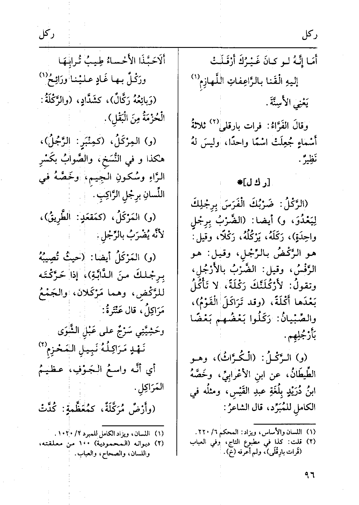 وَبائِعُهُ رَكَّالٌ، كشَدَّادٍ، والرَّكْلَةُ: الْحُزْمَةُ مِنَ الْبَقْلِ. والمِرْكَلُ، كمِنْبَرٍ: الرَّجُلُ، هَكَذَا وَفِي النُّسَخِ، والصَّوابُ بكَسْرِ الرَّاءِ وسُكونِ الجِيمِ، وخَصَّهُ فِي اللِّسانِ برِجْلِ الرَّاكِبِ. والمَرْكَلُ، كمَقْعَدٍ: الطَّرِيقُ، لنَّه يُضْرَبُ بالرِّجْلِ. والمَرْكَلُ أَيْضا: حيثُ تُصِيبُهُ بِرِجْلكَ منَ الدَّابَّةِ، إِذا حَرَّكْتَه للرَّكْضِ، وهما مَرْكَلان، والجَمْعُ مَرَاكِلُ، قَالَ عَنْتَرَةُ: