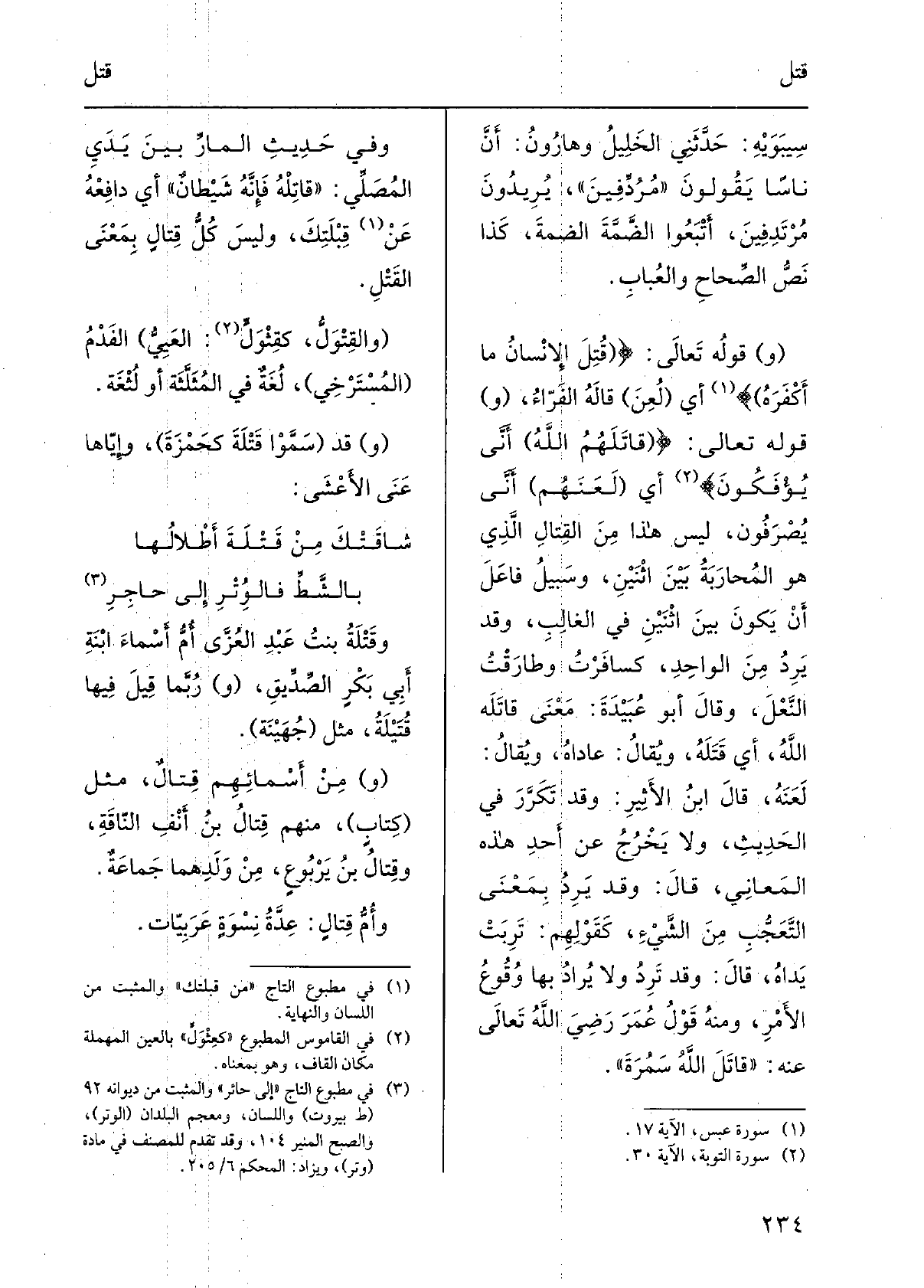 سِيبَوَيْهٍ: حدَّثَني الخليلُ وهارونُ: أنّ نَاسا يَقُولُونَ مُرُدِّفين، يريدونَ مُرْتَدِفين، أَتْبَعوا الضمّةَ الضمةَ، كَذَا نصُّ الصِّحاح والعُباب. قَوْله تَعالى: قُتِلَ الإنسانُ مَا أَكْفَرَه أَي لُعِنَ قَالَه الفَرّاء، قَوْله تَعالى: قاتَلَهم اللهُ أنَّى يُؤْفَكون أَي لَعَنَهم أنّى يُصرَفون، لَيْسَ هَذَا من القتالِ الَّذِي هُوَ المُحارَبةُ بَين اثنَيْن، وسَبيلُ فاعَلَ أَن يكونَ بَين اثنَيْنِ فِي الغالِب، وَقد يَرِدُ من الواحدِ، كسافَرْتُ وطارَقْتُ النَّعْلَ، وَقَالَ أَبُو عُبَيْدةَ: معنى قاتَلَه اللهُ، أَي قَتَلَه، وَيُقَال: عَادَاهُ، وَيُقَال: لَعَنَه، قَالَ ابنُ الْأَثِير: وَقد تكرَّرَ فِي الحَدِيث، وَلَا يخرجُ عَن أحدِ هَذِه الْمعَانِي، قَالَ: وَقد يَرِدُ بِمَعْنى التعَجُّبِ من الشيءِ، كقَولِهم: تَرِبَتْ يَدَاهُ، قَالَ: وَقد تَرِدُ وَلَا يُرادُ بهَا وُقوعُ الأمرِ، وَمِنْه قولُ عمرَ رَضِيَ الله تَعالى عَنهُ: قاتَلَ اللهُ سَمُرَةَ. وَفِي حديثِ المارِّ بَين يَدَيِ المُصَلِّي: قاتِلْهُ فإنّه شَيْطَانٌ أَي دافِعْه عَن قِبْلَتِكَ، وَلَيْسَ كلُّ قِتالٍ بِمَعْنى القَتْل. والقِتْوَلُّ، كقِثْوَلٍّ: العَيِيُّ الفَدْمُ المُستَرخي، لغةٌ فِي المُثَلّثَةِ أَو لُثْغَةٌ. قد سمَّوْا قَتْلَةَ كَحَمْزةَ، وإيّاها عَنى الْأَعْشَى: