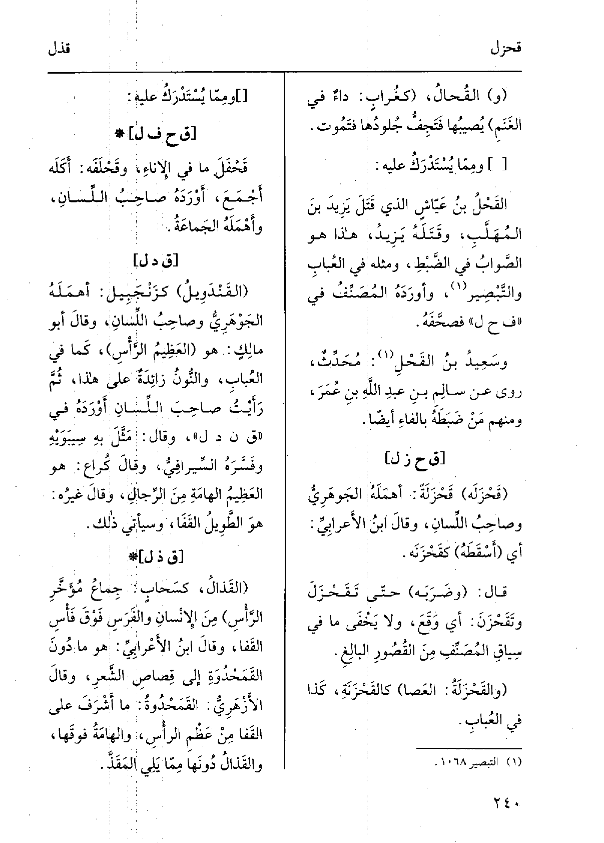 القُحال، كغُرابٍ: داءٌ فِي الغنَمِ يُصيبُها فتَجِفَّ جُلودُها فتموت. ومِمّا يُسْتَدْرَك عَلَيْهِ: القَحْلُ بنُ عَيّاشٍ الَّذِي قَتَلَ يَزيدَ بن المُهَلَّبِ، وَقَتَله يزيدُ، هَذَا هُوَ الصوابُ فِي الضبطِ، ومثلُه فِي العُباب والتبصير، وأوردَه المُصَنِّف فِي فَحل فصحَّفَه. وسعيدُ بنُ القَحْل: مُحدِّثٌ، روى عَن سالمِ بن عَبْد الله بن عمر، وَمِنْهُم من ضَبَطَه بالفاءِ أَيْضا.