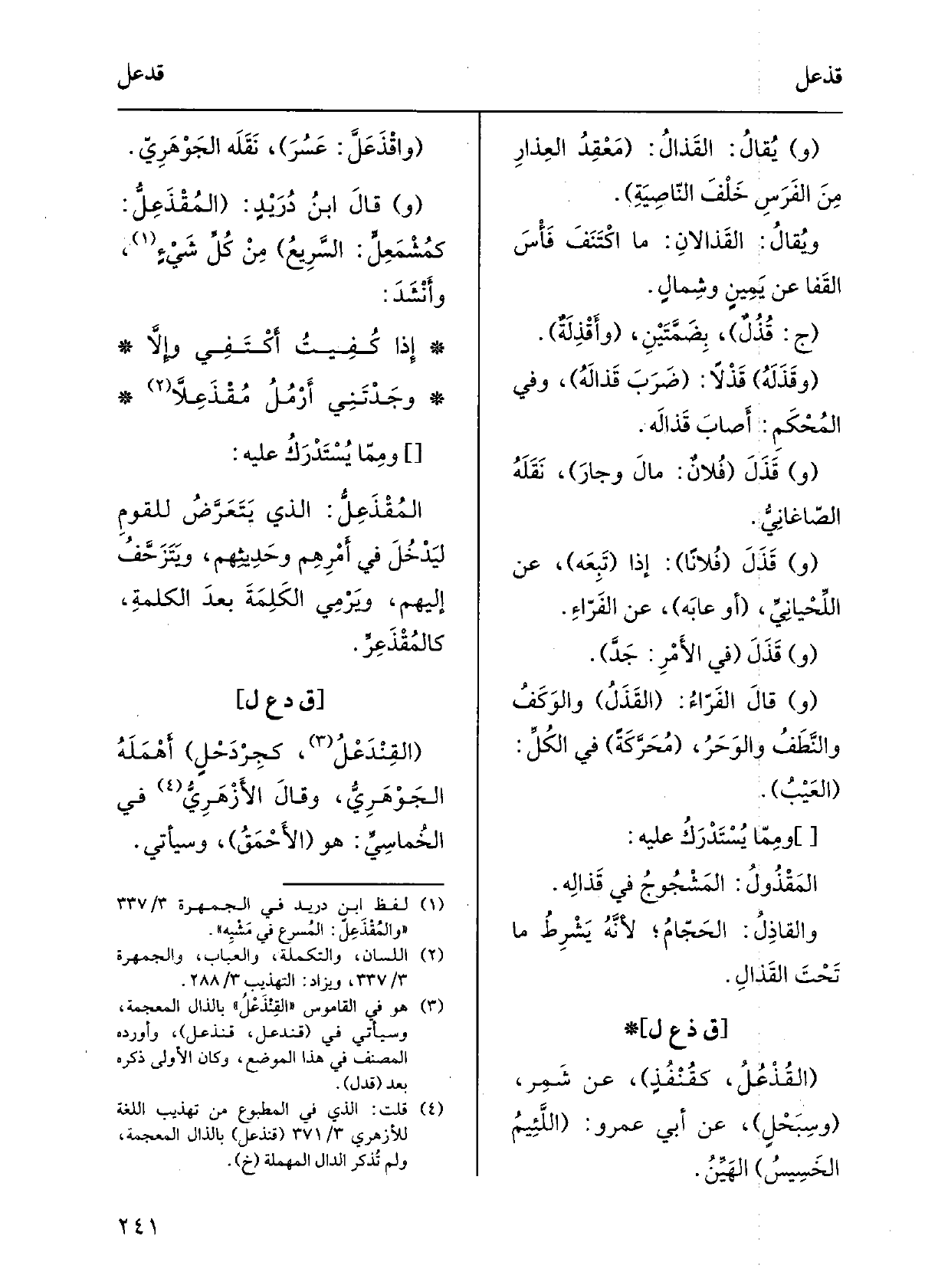 القُذْعُل، كقُنْفُذٍ، عَن شَمِرٍ، وسِبَحْلٍ، عَن أبي عَمْرو: اللئيمُ الخَسيسُ الهَيِّنُ. واقْذَعَلَّ: عَسُرَ، نَقله الجَوْهَرِيّ. قَالَ ابْن دُرَيْدٍ: المُقْذَعِلُّ: كمُشْمَعِلٍّ: السريعُ من كلِّ شيءٍ، وأنشدَ: إِذا كُفِيتُ أَكْتَفي وإلاّ وَجَدْتَني أَرْمُلُ مُقْذَعِلاً ومِمّا يُسْتَدْرَك عَلَيْهِ: المُقْذَعِلُّ: الَّذِي يَتَعَرَّضُ للقومِ ليدخُلَ فِي أمرِهم وحديثِهم، وَيَتَزحَّفُ إِلَيْهِم، وَيَرْمِي الكلمةَ بعد الكلمةِ، كالمُقْذَعِرِّ.