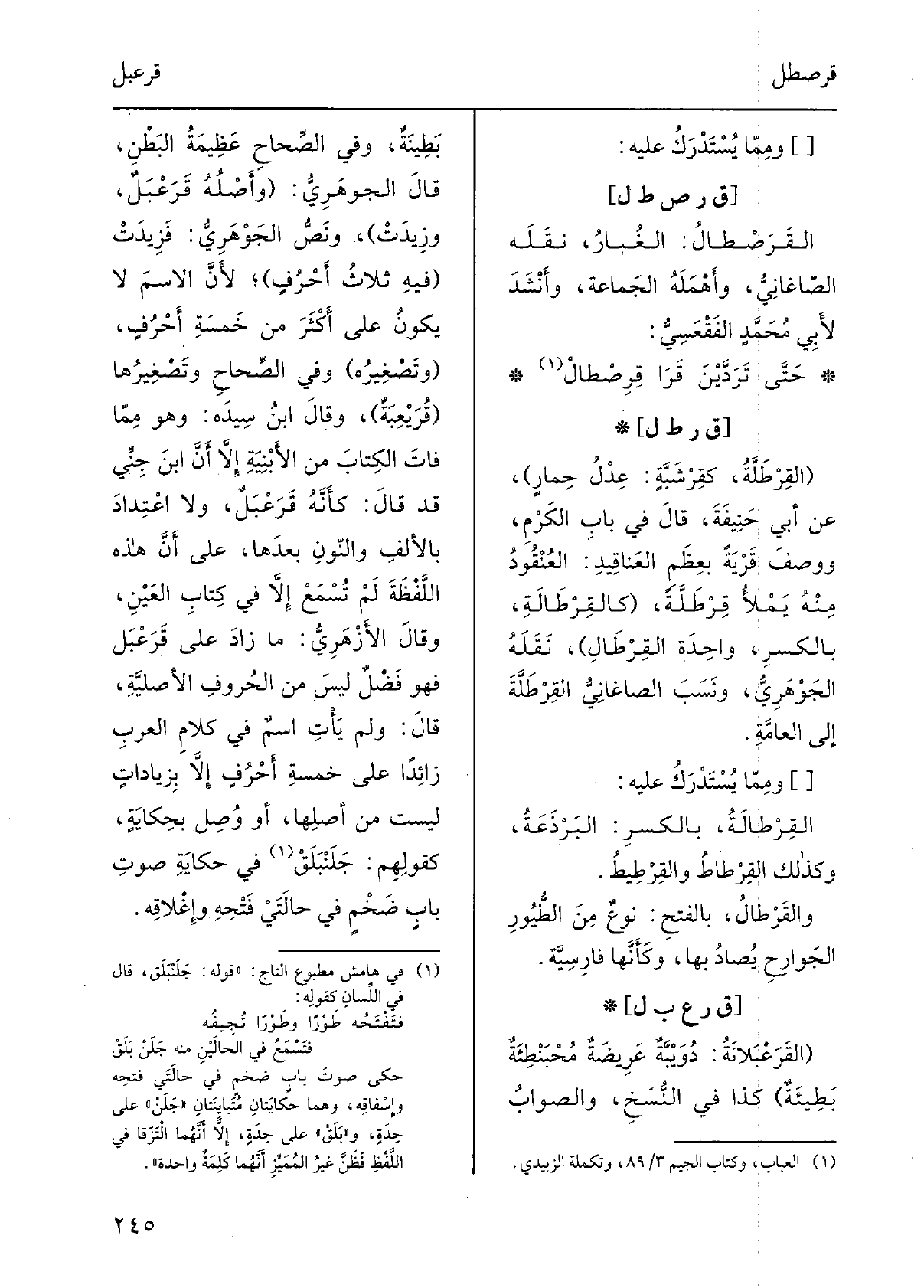 القِرْطَلَّةُ، كقِرْشَبَّةٍ: عِدْلُ حِمارٍ، عَن أَبي حنيفَةَ، قَالَ فِي بَاب الكَرْمِ، ووَصَفَ قريَةً بعِظَمِ العَناقيدِ: العُنقودُ منهُ يَملأُ قِرْطَلَّةً، كالقِرْطالَةِ، بالكَسرِ، وَاحِدَة القِرْطالِ، نَقله الجَوْهَرِيُّ، ونَسَبَ الصَّاغانِيُّ القِرْطَلَّةَ إِلَى العامَّةِ. ومِمّا يستدرَكُ عَلَيْهِ: القِرطالَةُ، بالكسْرِ: البَرْذَعَةُ، وكذلكَ القِرْطاطُ والقِرْطِيطُ. والقَرْطالُ، بالفتحِ: نوعٌ من الطُّيورِ الجَوارحِ يُصادُ بهَا، وكأَنَّها فارِسِيَّةٌ.