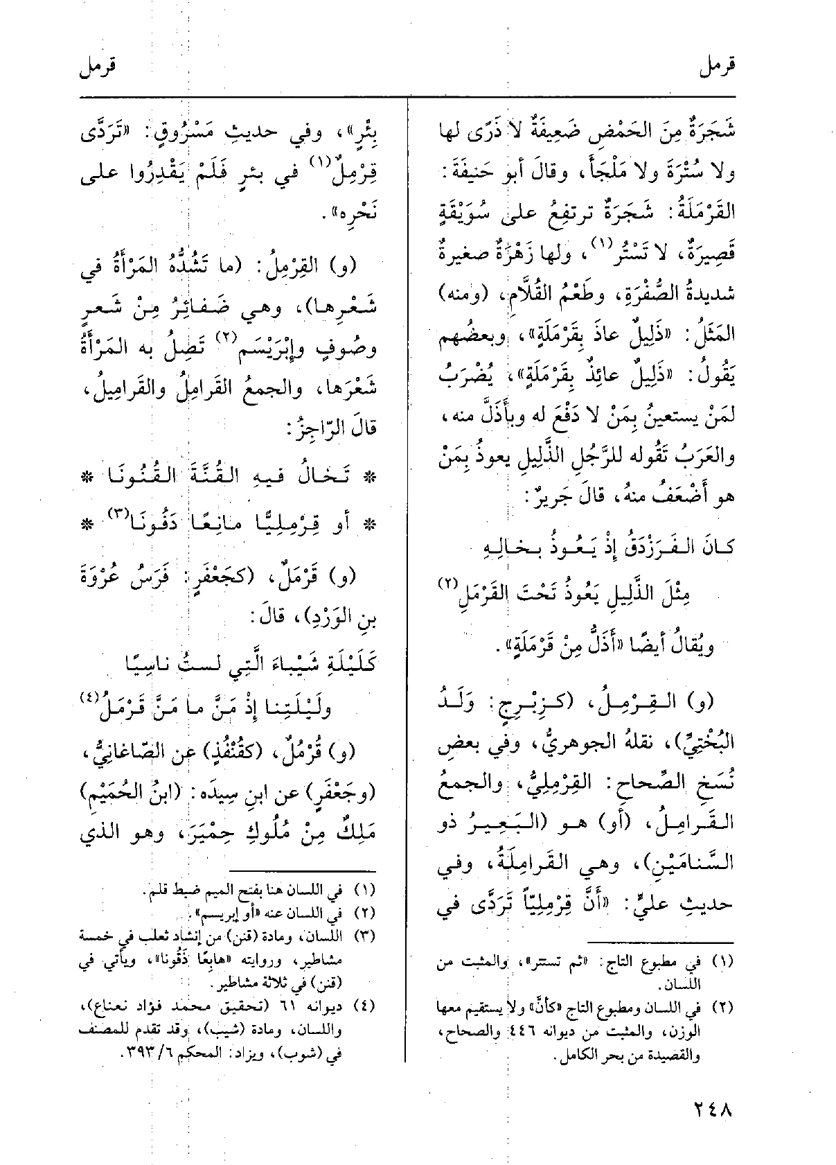 ويُقال أَيضاً: أَذَلُّ من قَرْمَلَةٍ. القِرْمِلُ، كزِبْرِجٍ: ولَدُ البُخْتِيِّ، نَقله الجَوْهَرِيُّ، وَفِي بعض نُسَخِ الصِّحاحِ: القِرْمِلِيُّ، والجَمعُ القَرامِلُ، أَو هُوَ البَعيرُ ذُو السَّنامَيْنِ، وَهِي القَرامِلَةُ، وَفِي حديثِ علِيٍّ: أَنَّ قِرْمِلِيّاً تَرَدَّى فِي بئرٍ، وَفِي حديثِ مَسروقٍ: تَرَدَّى قِرْمِلٌ فِي بئرٍ فَلم يَقدِروا على نَحرِهِ. والقِرْمِلُ: مَا تَشُدُّه المَرأَةُ فِي شَعرِها، وَهِي ضَفائرُ من شَعرٍ وصوفٍ وإبْرَيْسَم تَصِلُ بِهِ المرأَةُ شَعرَها، وَالْجمع القرامِلُ والقَرامِيلُ، قَالَ الرَّاجِزُ: تَخالُ فِيهِ القُنَّةَ القُنونا أَو قِرْمِلِيّاً مانِعاً دَفونا قَرْمَلٌ، كجَعْفَرٍ: فرَسُ عُرْوَةَ بنِ الوَرْدِ، قالَ: