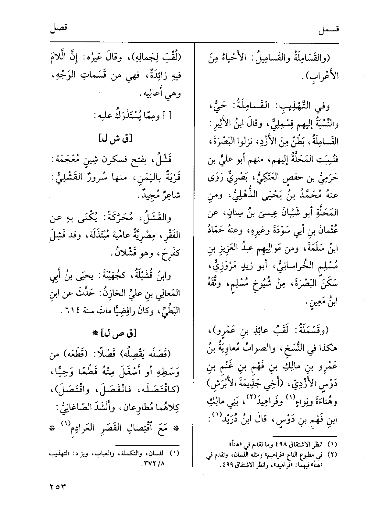 وَفِي التَّهْذِيب: القَسامِلَة: حَيٌّ والنِّسبَةُ إِلَيْهِم قِسْمِلِيٌّ، وَقَالَ ابنُ الْأَثِير: القَسامِلَةُ، بطنٌ من الأزْدِ، نزلُوا البَصرةَ، فنُسبِتْ المَحَلَّةُ إِلَيْهِم، مِنْهُم أَبُو عليٍّ بن حَرَمِيُّ بن حفصٍ العتَكِيُّ، بَصْرِيٌّ روى عَنهُ مُحَمَّد بن يحيى الذُّهْليُّ، وَمن المحَلَّةِ أَبُو شَيْبَانَ عِيسَى بن سِنانٍ، عَن عثمانَ بن أبي سَوْدَةَ وغيرِه، وَعنهُ حمّادُ بنُ سَلَمَةَ، وَمن مَواليهم عبدُ الْعَزِيز بن مُسلِمٍ الخُراسانِيُّ، أَبُو زيدٍ مَرْوَزِيٌّ، سَكَنَ البَصرةَ، من شيوخِ مُسلِمٍ، وثَّقَه ابنُ مُعينٍ. وقَسْمَلةُ: لقَبُ عائِذِ بن عمروٍ، هَكَذَا فِي النّسخ، والصوابُ مُعاوِيَةُ بن عَمْرِو بن مالكِ بن فَهْمِ بن غَنْمِ بن دَوْسٍ الأَزْديّ، أخي جَذيمَةَ الأَبْرَشِ وهُناءَةَ ونِواءٍ وفَراهيدَ، بَني مالكِ بن فَهْمِ بنِ دَوْسٍ، قَالَ ابْن دُرَيْدٍ: لُقِّبَ لجَمالِه، وَقَالَ غيرُه: إنّ اللامَ فِيهِ زائدةٌ، فَهِيَ من قَسَمَاتِ الوَجهِ، وَهِي أعاليه. ومِمّا يُسْتَدْرَك عَلَيْهِ: