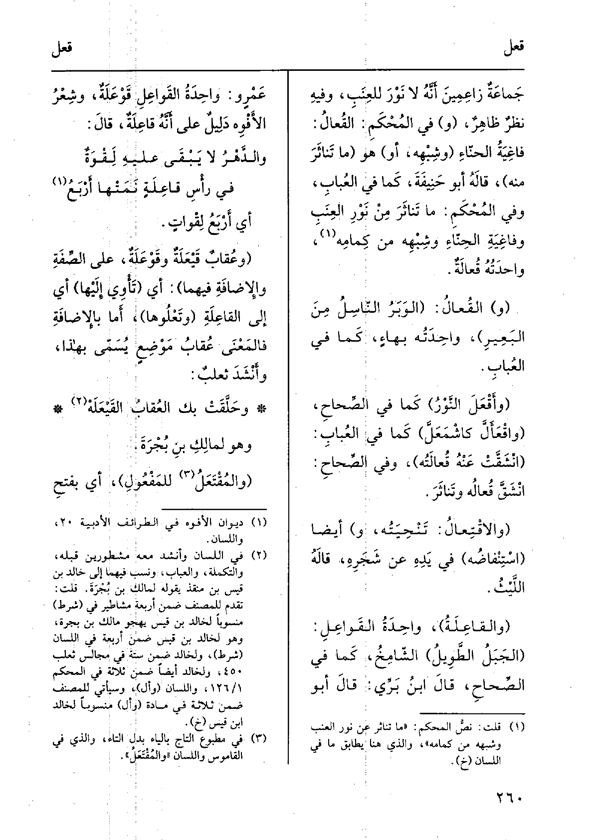 جماعةٌ زاعِمينَ أنّه لَا نَوْرَ للعنبِ، وَفِيه نظرٌ ظاهرٌ، فِي المُحْكَم: القُعال: فاغِيَةُ الحنّاءِ وشِبْهِه، أَو هُوَ مَا تناثَرَ مِنْهُ، قَالَه أَبُو حنيفةَ، كَمَا فِي العُباب، وَفِي المُحْكَم: مَا تناثَرَ من نَوْرِ العنبِ وفاغِيَةِ الحِنّاءِ وشِبْهِه من كِمامِه، واحدتُه قُعالَةٌ. القُعال: الوبَرُ الناسِلُ من البعيرِ، واحدتُه بهاءٍ، كَمَا فِي العُباب. وأَقْعَلَ النَّوْرُ كَمَا فِي الصِّحاح، واقْعَأَلَّ كاشْمَعَلَّ كَمَا فِي العُباب: انْشقَّتْ عَنهُ قُعالَتُه، وَفِي الصِّحاح: انْشقَّ قُعالَه وتناثَرَ. والاقْتِعال: تَنْحِيتُه، وَأَيْضًا اسْتِنْفاضُه فِي يدِه عَن شجرِه، قَالَه الليثُ. والقاعِلَة، واحدةُ القَواعِل: الجبَلُ الطويلُ الشامخُ، كَمَا فِي الصِّحاح، قَالَ ابنُ بَرِّي: قَالَ أَبُو عمروٍ: واحدةُ القَواعِلِ قَوْعَلَةٌ، وشِعرُ الأَفْوِه دليلٌ على أنّه قاعِلَةٌ، قَالَ: