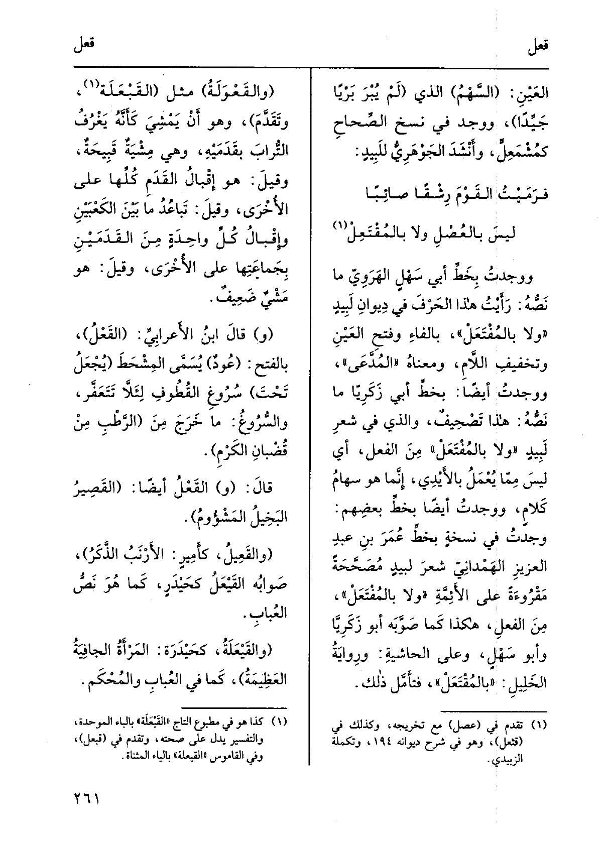 ووجدتُ بخطِّ أبي سَهلٍ الهَرَويِّ مَا نصُّه: رأيتُ هَذَا الحرفَ فِي ديوانِ لَبيدٍ: وَلَا بالمُفْتَعَلْ، بِالْفَاءِ وفتحِ العَينِ وتخفيفِ اللامِ، وَمَعْنَاهُ المُدَّعَى، ووجدتُ أَيْضا: بخطِّ أبي زكرِيّا مَا نصُّه: هَذَا تَصحيفٌ، وَالَّذِي فِي شِعرِ لَبيدٍ: وَلَا بالمُفْتَعَلْ، من الْفِعْل، أَي ليسَ ممّا يُعمَلُ بِالْأَيْدِي، إنّما هُوَ سهامُ كَلامٍ، ووجدتُ أَيْضا بخطِّ بعضِهم: وجدتُ فِي نسخةٍ بخطِّ عمرَ بن عبدِ العزيزِ الهَمْدانيّ شعرَ لبيدٍ مُصَحَّحةً مَقْرُوءةً على الأئمّة: وَلَا بالمُفْتَعَلْ، من الْفِعْل، هَكَذَا كَمَا صوَّبَه أَبُو زكريّا وَأَبُو سَهلٍ، وعَلى الْحَاشِيَة: وروايةُ الْخَلِيل: بالمُفْتَعَلْ، فتأمَّلْ ذَلِك. والقَعْوَلَةُ مثل القَبْعَلَة، وتقدّم، وَهُوَ أَن يمشيَ كأنّه يَغْرُفُ الترابَ بقَدمَيْه، وَهِي مِشيَةٌ قبيحةٌ، وَقيل: هُوَ إقبالُ القدَمِ كلِّها على الأُخرى، وَقيل: تباعُدُ مَا بَين الكَعبَيْنِ وإقْبالُ كلِّ واحدةٍ من القَدمَيْنِ بجَماعتِها على الأُخرى، وَقيل: هُوَ مَشْيٌ ضعيفٌ. قَالَ ابْن الأَعْرابِيّ: القَعْل، بالفَتْح: عُودٌ يُسمّى المِشْحَطَ يُجعلُ تَحت سُروغِ القُطوفِ لئلاّ تَتَعَفَّرَ، والسُّروغ: مَا خرجَ من الرَّطْبِ من قُضبانِ الكَرْم.