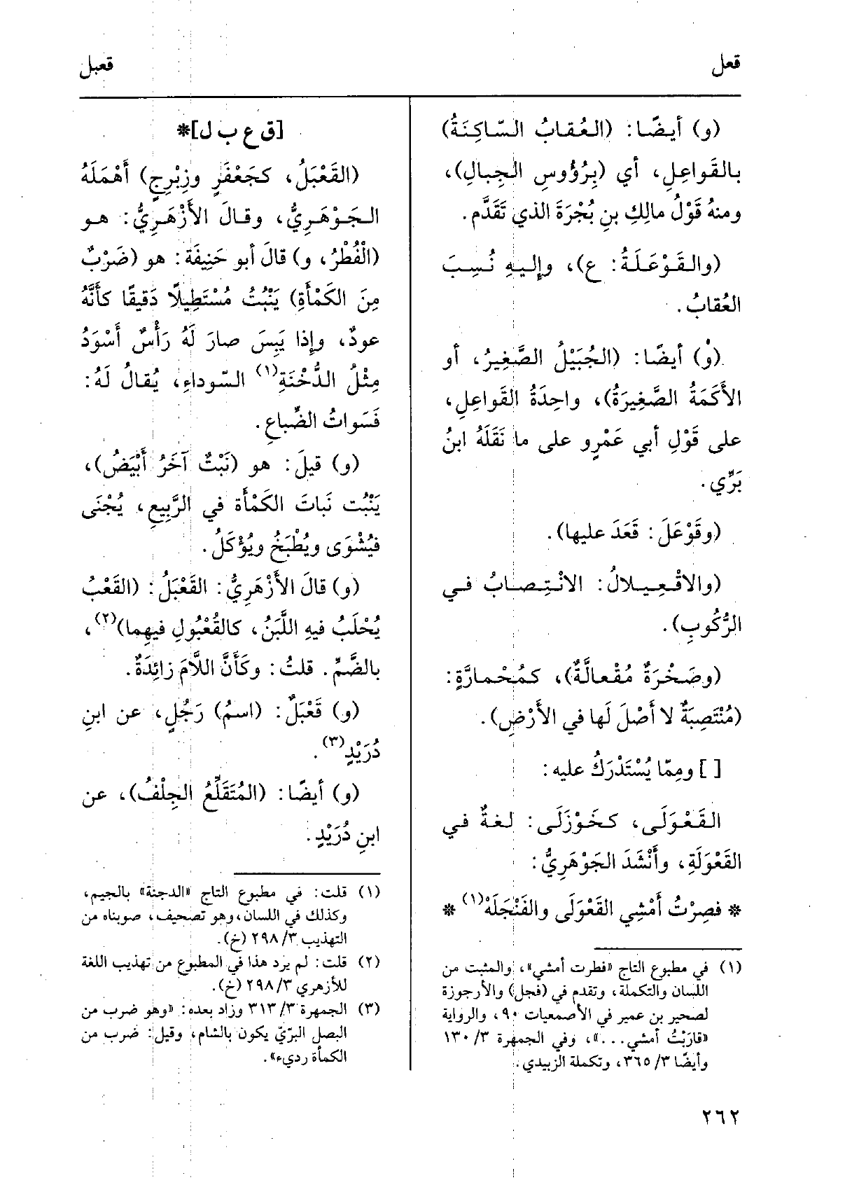 القَعْبَل، كَجَعْفَرٍ وزِبْرِجٍ أهمله الجَوْهَرِيّ، وَقَالَ الأَزْهَرِيّ: هُوَ الفُطْرُ، وَقَالَ أَبُو حنيفَة: هُوَ ضَربٌ من الكَمْأَةِ ينبتُ مُستَطيلاً دَقيقاً لَهُ رأسٌ أَسْوَدُ مثلُ الدُّخْنَةِ السَّوْدَاء، يُقَال لَهُ: فَسَوَاتُ الضِّباع. قيل: هُوَ نَبتٌ آخَرُ أَبْيَض، ينبتُ نَباتَ الكَمْأَةِ فِي الرّبيع، يُجنى فيُشوى ويُطبَخُ ويُؤكَل.