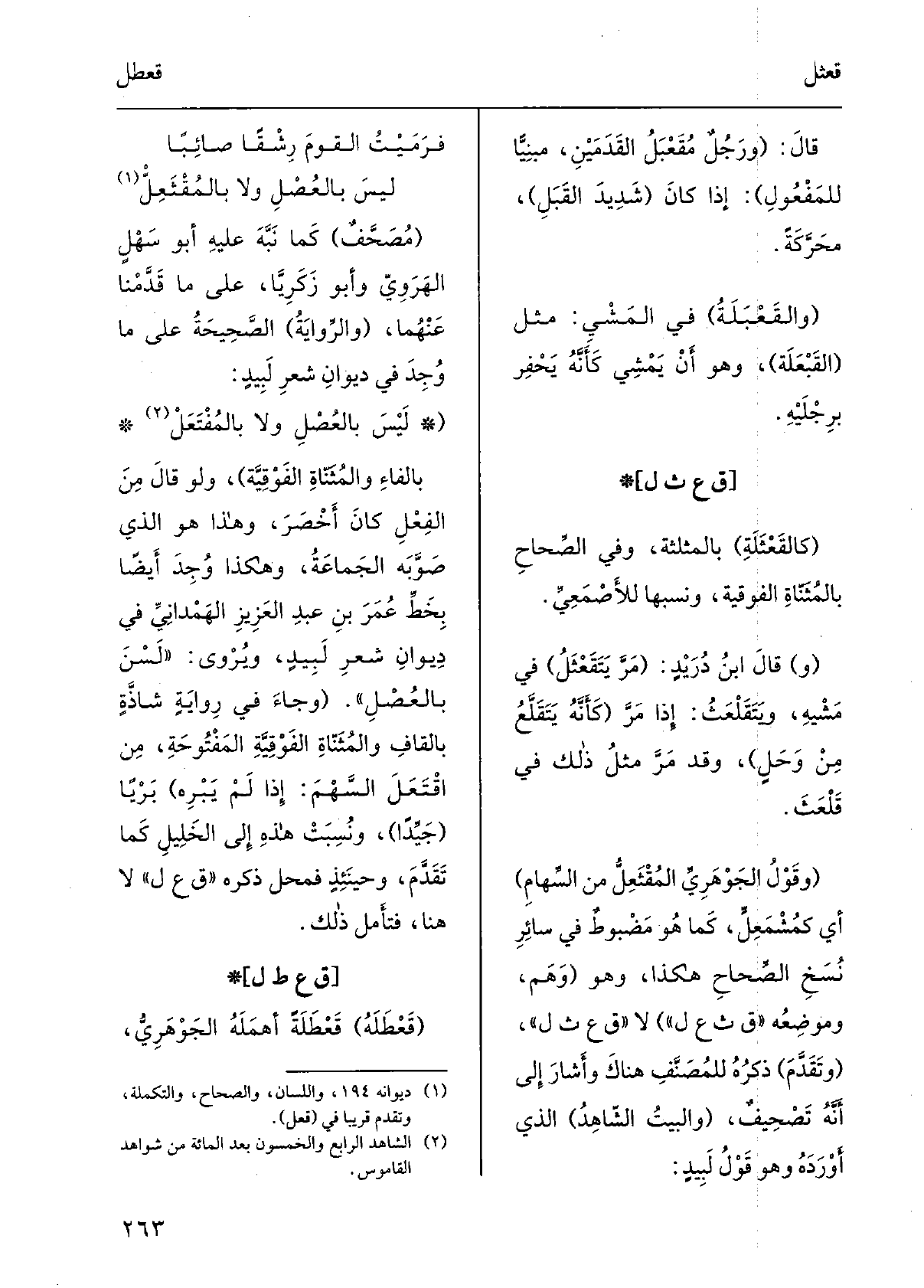مُصَحَّفٌ كَمَا نبّه عَلَيْهِ أَبُو سهلٍ الهرَوِيّ وَأَبُو زكرِيّا، على مَا قدّمنا عَنْهُمَا، والروايةُ الصحيحةُ على مَا وُجِدَ فِي ديوانِ شعرِ لَبيدٍ: لَيْسَ بالعُصْلِ وَلَا بالمُقْثَعِلْ بالفاءِ والمُثَنّاةِ الفوقيّة، وَلَو قالَ من الفِعلِ كَانَ أَخْصَر، وَهَذَا هُوَ الَّذِي صوَّبَه الجماعةُ، وَهَكَذَا وُجِدَ أَيْضا بخطِّ عمرَ بنِ عبدِ العزيزِ الهَمْدانيِّ فِي ديوانِ شعرِ لَبيدٍ، ويُروى: لَسْنَ بالعُصْلِ.