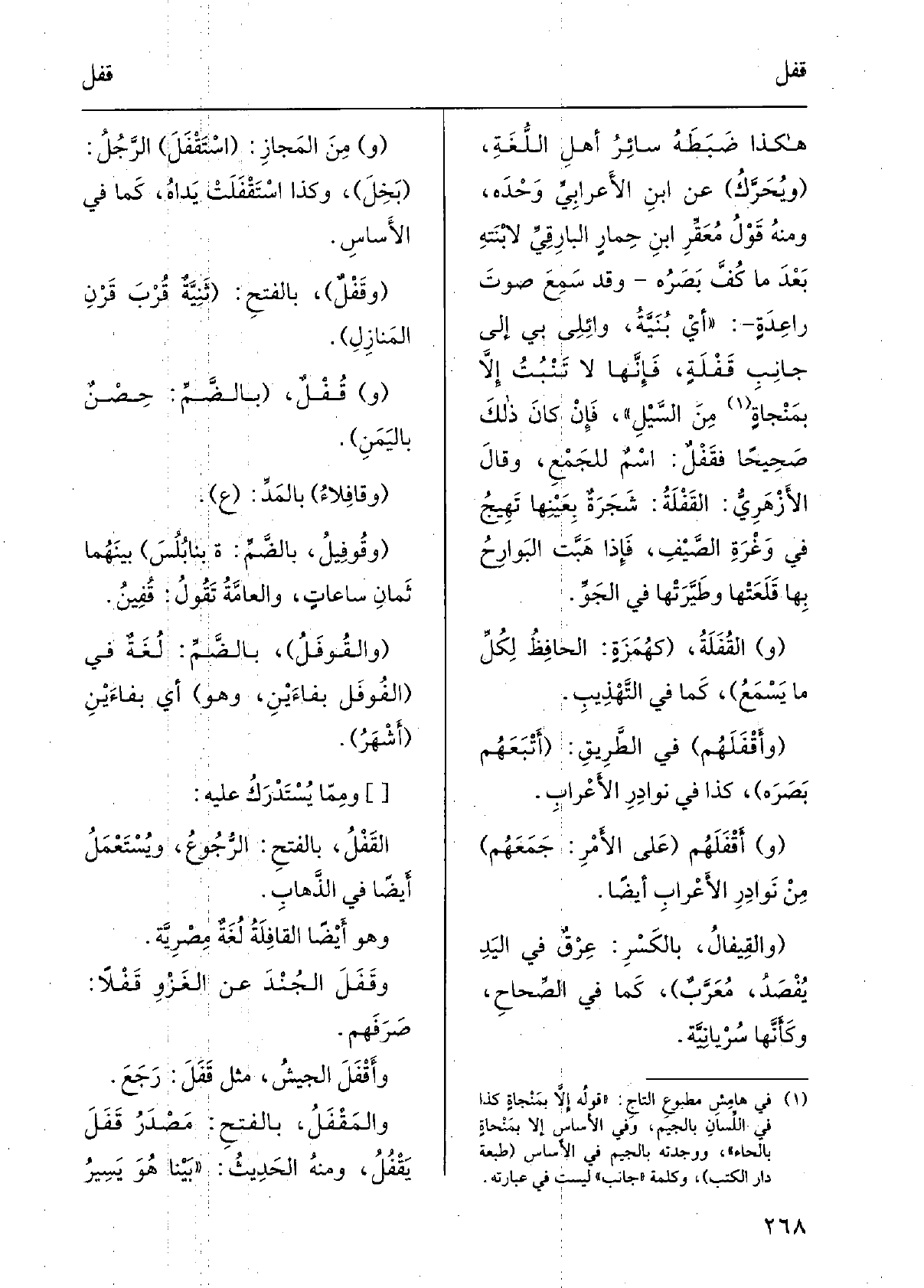 والقُوفَلُ، بالضَّمّ: لغةٌ فِي الفُوفَل بفاءَيْن، وَهُوَ أَي بفاءَيْنِ أَشْهَرُ. ومِمّا يُسْتَدْرَك عَلَيْهِ: القَفْلُ، بالفَتْح: الرُّجوع، ويُستعمَلُ أَيْضا فِي الذَّهاب. وَهُوَ أَيْضا القافِلَةُ لغةٌ مِصريّةٌ. وقَفَلَ الجُندَ عَن الغَزوِ قَفْلاً: صَرَفَهم. وأَقْفَلَ الجيشُ، مثل قَفَلَ: رَجَعَ. والمَقْفَلُ، بالفَتْح: مصدرُ قَفَلَ يَقْفُلُ، وَمِنْه الحَدِيث: بَينا هُوَ يسيرُ