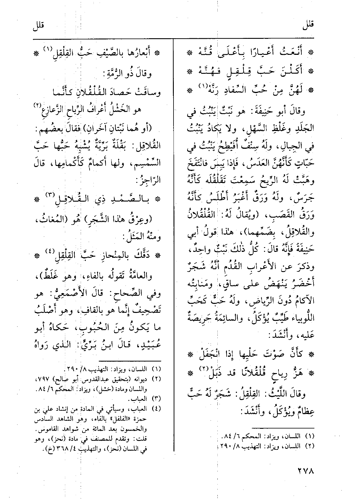 أَنْعَتُ أَعْياراً بأَعْلى قُنَّهْ أَكَلْنَ حَبَّ {قِلْقِلٍ فَهُنَّهْ لَهُنَّ من حُبِّ السِّفادِ رَنَّهْ وَقَالَ أَبو حنيفةَ: هُوَ نبتٌ ينبُتُ فِي الجَلَدِ وغَلْظِ السَّهْلِ، وَلَا يكادُ يَنبُتُ فِي الجِبالِ، ولهُ سِنْفٌ أُفَيْطِحُ يَنبُتُ فِي حَبّاتٍ كأَنَّهُنَّ العَدَسُ، فَإِذا يَبٍ سَ فانْتَفَخَ وهَبَّتْ لَهُ الرِّيحُ سمعْتَ} تَقَلْقُلَه كأَنَّه جرَسٌ، وَله ورقٌ أَغبرُ أَطْلَسُ كأَنَّه ورقُ القصَبِ، ويقالُ لَهُ: {القُلْقُلانُ} والقُلاقِلُ، بضَمِّهما، هَذَا قولُ أَبي حنيفَةَ فإنَّه قَالَ: كلُّ ذلكَ نَبْتٌ واحدٌ، وَذكر عَن الأَعرابِ القُدُمِ أَنَّه شجَرٌ أَخْضَرُ ينهَضُ على ساقٍ، ومَنابِتُهُ الآكامُ دونَ الرِّياضِ، وَله حَبٌّ كحَبِّ اللُّوبياءِ طَيِّبٌ يؤْكَلُ، والسّائمَةٌ حريصَةٌ عَلَيْهِ، وأَنشدَ: كأَنَّ صَوتَ حَلْيِها إِذا انْجَفَلْ هَزُّ رِياحٍ {قُلْقُلاناً قد ذَبَلْ وَقَالَ الليثُ:} القِلْقِلُ: شجَرٌ لَهُ حَبٌّ عِظامٌ ويؤكَلُ، وأَنشدَ: أَبعارُها بالصَّيْفِ حَبُّ القِلْقِلِ.