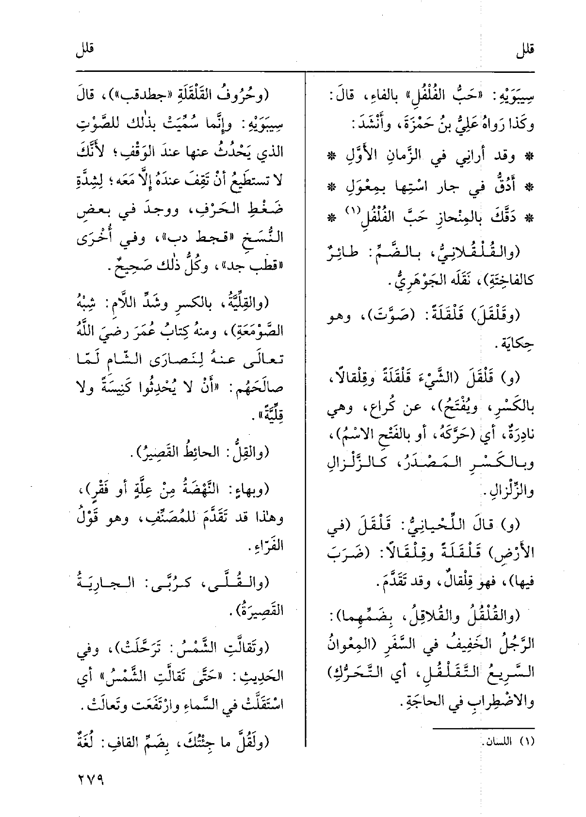 {والقُلقُلانِيُّ، بالضَّمِّ: طائرٌ كالفاخِتَةِ، نَقله الجَوْهَرِيُّ.} وقَلْقَلَ {قلْقَلَةً: صَوَّتَ، وَهُوَ حِكاية. (و) } قَلْقَلَ الشيءَ قلْقَلَةً {وقِلْقالاً، بالكَسْرِ، ويُفتَحُ، عَن كُراع، وَهِي نادِرَةٌ، أَي حرَّكَه، أَو بِالْفَتْح الاسمُ، وبالكَسْرِ المَصْدَرُ، كالزَّلْزالِ والزِّلْزالِ. قَالَ اللِّحيانِيُّ: قَلْقَلَ فِي الأَرضِ قَلْقَلَةً وقِلْقالاً: ضَرَبَ فِيهَا، فَهُوَ} قِلْقالٌ، وَقد تقدَّمَ. {والقُلْقُلُ} والقُلاقِلُ، بضَمِّهما: الرجلُ الخفيفُ فِي السَّفَرِ، المِعوانُ السَّريعُ {التَّقَلْقُلِ، أَي التَّحَرُّكِ، والاضْطِرابِ فِي الحاجَةِ. وحروفُ} القَلْقَلَةِ: جطدقب، قَالَ سيبويهِ: وإنَّما سُمِّيَت بذلكَ للصَّوتِ الَّذِي يحُثُ عَنَّا عندَ الوَقْفِ، لأَنَّكَ لَا تستطيعُ أَنْ تقِفُ عندَهُ إلاّ مَعَه، لِشِدَّةِ ضَغْطِ الحَرْفِ، ووجدَ فِي بعضِ النُّسَخِ: قجط دب، وَفِي أُخرى: قطب جد، وكُلُّ ذلكَ صَحِيح. {والقِلِّيَّةُ، بِالْكَسْرِ وشَدِّ اللامِ: شِبْهُ الصَّوْمَعَةِ، وَمِنْه كتابُ عُمرَ رَضِي الله تَعَالَى عَنهُ لِنَصارى الشّامِ لمّا صالَحَهُم: أَن لَا يُحدِثوا كنيسَةً وَلَا} قِلِّيَّةً. {والقِلُّ: الحائطُ القصيرُ. وبِهاءٍ: النَّهضَةُ من عِلَّةٍ أَو فَقْرٍ، وَهَذَا قد تقدَّمَ للمُصَنِّفِ، وَهُوَ قولُ الفرّاءِ.} والقُلَّى، كرُبَّى: الجارِيَةُ القصيرَةُ. {وتَقالَّتِ الشَّمْسُ: تَرَحَّلَتْ، وَفِي الحديثِ: حتّى تقالَّتِ الشَّمْسُ أَي} استقَلَّتْ فِي السَّماءِ وارتفعَت وتَعالَت.! ولَقُلَّ مَا جِئْتُكَ، بضَمِّ القافِ: لُغَةٌ