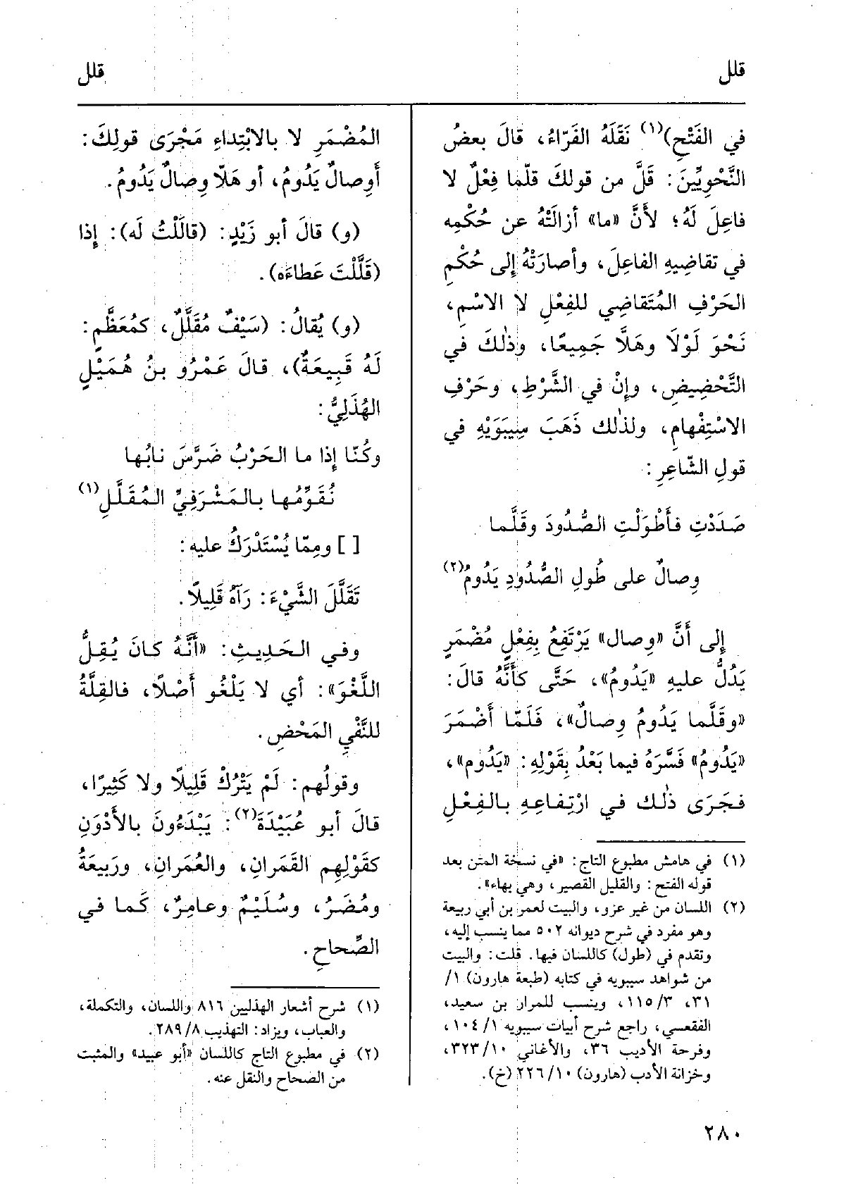 إِلَى أَنَّ وِصال يَرتَفِعُ بفِعْلٍ مُضْمَرٍ يَدُلُّ عَلَيْهِ يَدومُ، حتّى كأَنَّه قَالَ: وقلَّما يَدومُ وِصالٌ، فلمّا أَضْمَرَ يَدومُ فَسَّرَهُ فِيمَا بعدُ بقولِهِ: يَدومُ، فَجرى ذلكَ فِي ارتِفاعِه بالفِعْلِ المُضْمَرِ لَا بالابتداءِ مَجرى قولِكَ: أَوِصالٌ يَدومُ، أَو هَلاّ وِصالٌ يَدومُ. قَالَ أَبو زَيدٍ:} قالَلْتُ لهُ: إِذا قَلَّلْتَ عطاءَه. يُقال: سَيْفٌ {مُقَلَّلٌ، كمُعَظَّمٍ: لَهُ قَبيعَةٌ، قَالَ عَمرو بنُ هُمَيْلٍ الهُذَلِيُّ: