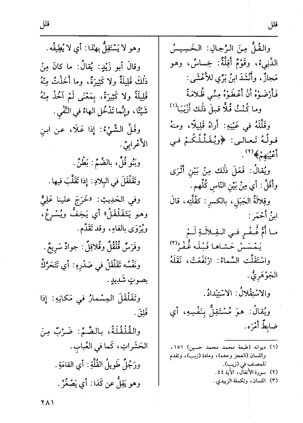 } وقَلَّ الشيءُ: إِذا علا، عَن ابْن الأَعْرابِيِّ. وبَنو {قُلٍّ، بالضَّمِّ: بَطْنٌ.} وتَقَلْقَلَ فِي البلادِ: إِذا تقَلَّبَ فِيهَا. وَفِي الحديثِ: خرَجَ علينا علِيٌّ وَهُوَ {يتقلْقَلُ، أَي يَخِفُّ ويُسْرِعُ، ويُروى بالفاءِ، وَقد تقدَّمَ.
