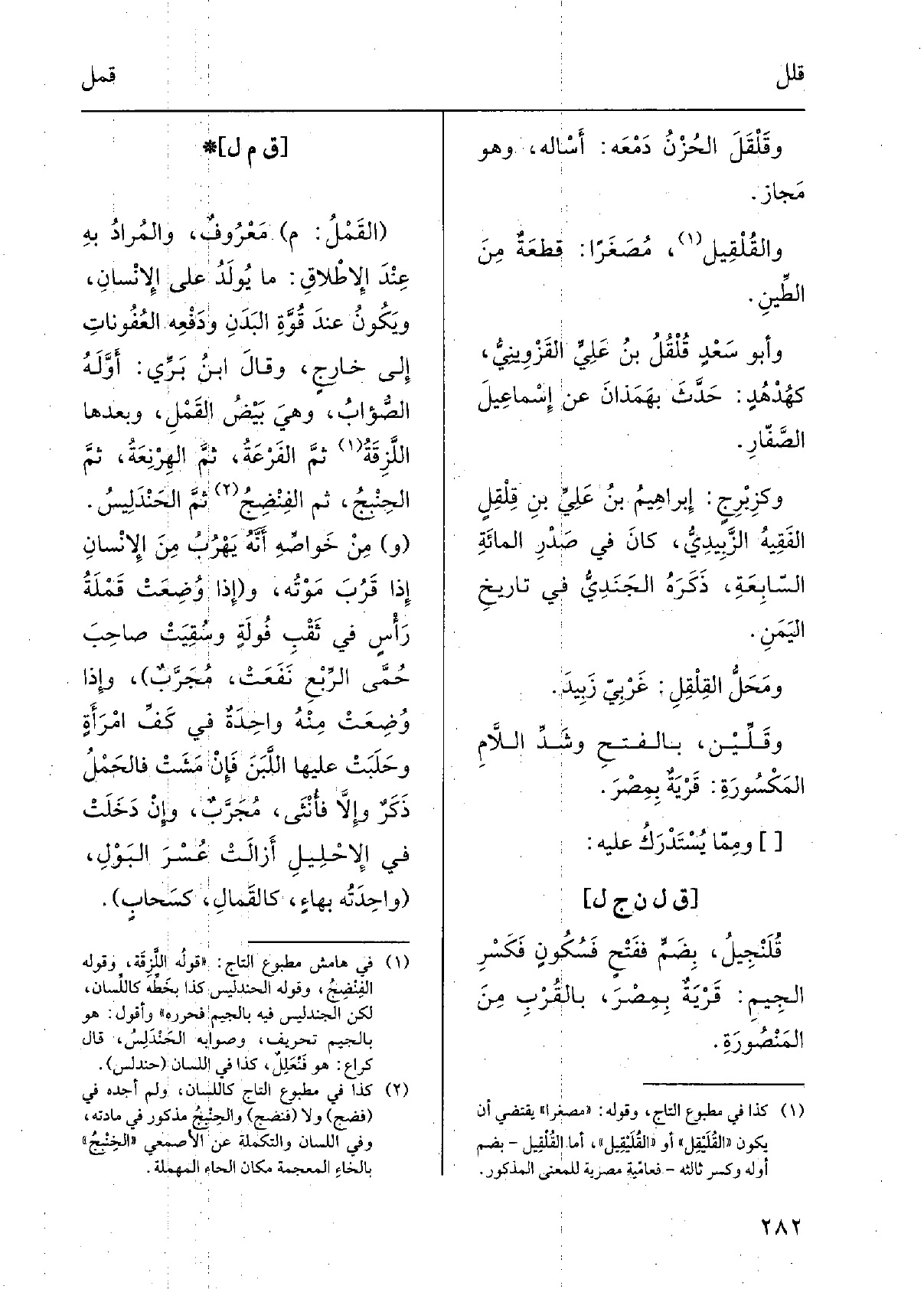 القَمْلُ: م: مَعروفٌ، والمُرادُ بِهِ عِنْد الإطلاقِ: مَا يُولَدُ على الإنسانِ، ويكونُ عندَ قوَّةِ البَدَنِ ودَفعِهِ العُفوناتِ إِلَى خارِجٍ، وَقَالَ ابنُ برّيّ: أَوَّلَهُ الصُّؤابُ، وَهِي بَيْضُ القَمْلِ، وبعدَها اللَّزِقَةُ ثمَّ الفَرْعَةُ، ثمَّ الهِرْنِعَةُ، ثمَّ الحِنْبِجُ، ثمَّ الفِنْضِجُ، ثمَّ الحَنْدَليسُ، من خَواصِّه أَنَّه يَهرُبُ من الإنسانِ إِذا قَرُبَ موتُه، وَإِذا وُضِعَتْ قَمْلَةُ رأْسٍ فِي ثَقْبِ فولَةٍ وسُقِيَتْ صاحِبَ حُمَّى الرِّبْعِ نفعَتْ، مُجَرَّبٌ، وَإِذا وُضِعَتْ مِنْهُ واحدةٌ فِي كَفِّ امرأَةٍ وحَلَبَتْ عَلَيْهَا اللَّبَنَ فإنْ مَشَتْ فالحَمْلُ ذَكَرٌ وإلاّ فأُنْثى، مُجَرَّبٌ، وإنْ دخلَتْ فِي الإحليلِ أَزالَتْ عُسْرَ البَوْلِ، واحِدَتُه بهاءٍ، كالقَمالِ، كسَحابٍ.