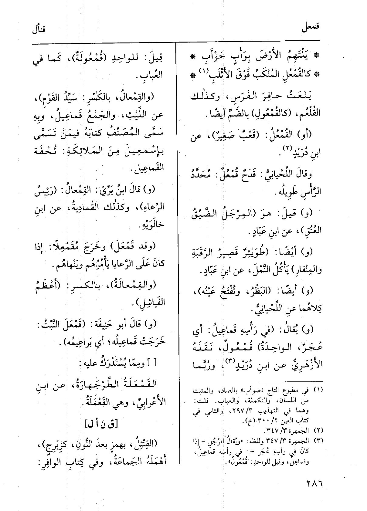 يَلْتَهِمُ الأرضَ بوَأْبٍ حَوْأَبِ كالقُمْعُلِ المُنْكَبِّ فوقَ الأَثْلَبِ يَنْعَتُ حافِرَ الفرَسِ، وَكَذَلِكَ القُلْعُم، كالقُعْمول بالضَّمّ أَيْضا. أَو القُمْعُل: قَعْبٌ صغيرٌ، عَن ابْن دُرَيْدٍ. وَقَالَ اللِّحْيانِيّ: قَدَحٌ قُمْعُلٌ: مُحَدَّدُ الرأسِ طويلُه. قيل: هُوَ المِرْجَلُ الضيِّقُ العنُقِ، عَن ابنِ عَبَّادٍ. أَيْضا: طُوَيْئِرٌ قصيرُ الرَّقَبةِ والمِنْقارِ يأكلُ النَّمْلَ، عَن ابنِ عَبَّادٍ. أَيْضا: البَظْرُ، وتُفتَحُ عَيْنُه، كِلَاهُمَا عَن اللِّحْيانِيّ. يُقَال: فِي رَأْسِه قَماعيلُ: أَي عُجَرٌ، الواحدةُ قُمْعولٌ، نَقله الأَزْهَرِيّ عَن ابْن دُرَيْدٍ، وربّما قيل للْوَاحِد: قُمْعولَةٌ، كَمَا فِي العُباب. والقِمْعال، بالكَسْر: سَيِّدُ القومِ، عَن الليثِ، والجمعُ قَماعيل، وَبِه سمَّى المُصَنِّف كتابَه فيمَن تَسَمَّى بإسْمعِيلَ من الملائكةِ: تُحْفَةِ القَماعيل. قَالَ ابنُ بَرِّي: القِمْعال: رئيسُ الرِّعاء، وَكَذَلِكَ القُمادِية، عَن ابنِ خالَوَيْه. وَقد قَمْعَلَ وخرجَ مُقَمْعِلاً: إِذا كَانَ على الرَّعايا يأمرُهم وينهاهم. والقِمْعالَة، بالكَسْر: أعظمُ الفَياشِل. قَالَ أَبُو حنيفَة: قَمْعَلَ النبْتُ: خَرَجَتْ قَماعيلُه أَي بَراعيمُه. ومِمّا يُسْتَدْرَك عَلَيْهِ: القَمْعَلَةُ الطَّرْجَهارَةُ، عَن ابْن الأَعْرابِيّ، وَهِي القَعْمَلَة.