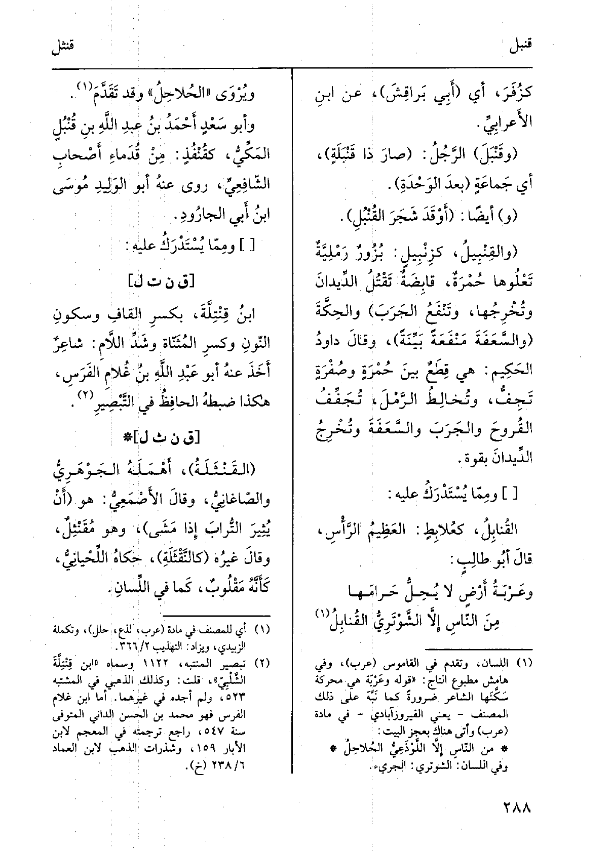 كزُفَرٍ، أَي أبي بَراقِشَ، عَن ابْن الأَعْرابِيّ. وقَنْبَلَ الرجلُ: صارَ ذَا قَنْبَلةٍ، أَي جماعةٍ بعدَ الوَحْدَةِ. أَيْضا: أَوْقَدَ شَجَرَ القُنْبُلِ. والقِنْبيلُ، كزِنْبيلٍ: بُزورٌ رَمْلِيّةٌ تعلوها حُمرَةٌ، قابِضةٌ تَقْتُلُ الدِّيدانَ وتُخرِجُها، وتنفعُ الجَرَبَ والحِكَّةَ والسَّعَفَةَ مَنْفَعةً بَيِّنَةً، وَقَالَ داودُ الحكيمُ: هِيَ قِطَعٌ بَين حُمرَةٍ وصُفرَةٍ تَجِفُّ، وتُخالِطُ الرَّمْلَ، تُجَفِّفُ القُروحَ والجرَبَ والسَّعَفةَ وتُخرجُ الديدانَ بقُوّةٍ. ومِمّا يُسْتَدْرَك عَلَيْهِ: القُنابِل، كعُلابِطٍ: العظيمُ الرأسِ، قَالَ أَبُو طالبٍ: