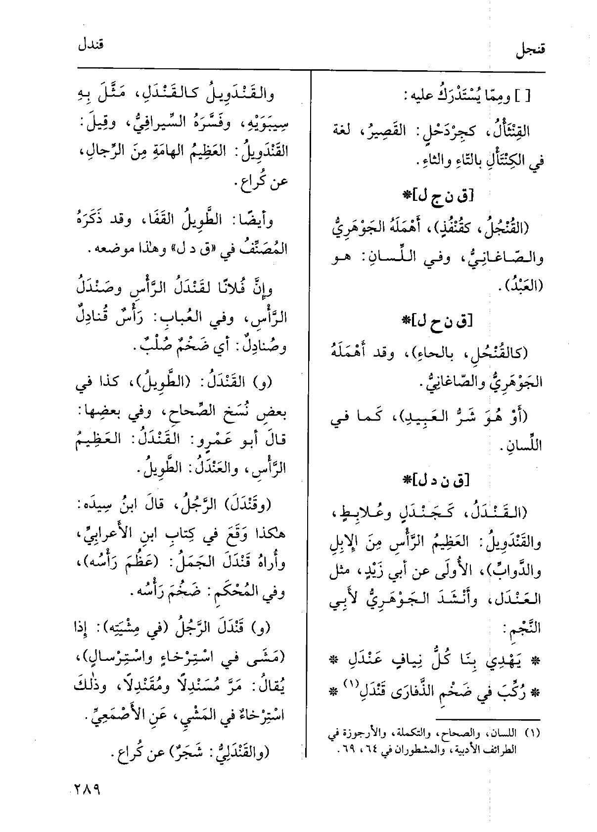 القَنْدَلُ، كَجَنْدَلٍ وعُلابِطٍ، والقَنْدَوِيلُ: العظيمُ الرأسِ من الإبلِ والدّوابِّ، الأُولى عَن أبي زيدٍ، مثل العَنْدَل، وأنشدَ الجَوْهَرِيّ لأبي النَّجم: يَهْدِي بِنَا كلَّ نِيافٍ عَنْدَلِ رُكِّبَ فِي ضَخْمِ الذَّفارَى قَنْدَلِ والقَنْدَويل كالقَنْدَل، مَثَّلَ بِهِ سِيبَوَيْهٍ، وفسَّرَه السِّيرافيُّ، وَقيل: القَنْدَويل: العظيمُ الهامةِ من الرِّجَال، عَن كُراعٍ. وَأَيْضًا: الطويلُ القفَا، وَقد ذَكَرَه المُصَنِّف فِي قدل وَهَذَا موضعُه. وإنّ فلَانا لَقَنْدَلُ الرأسِ وَصَنْدَلُ الرأسِ، وَفِي العُباب: رأسٌ قُنادِلٌ وصُنادِلٌ: أَي ضخمٌ صُلبٌ.