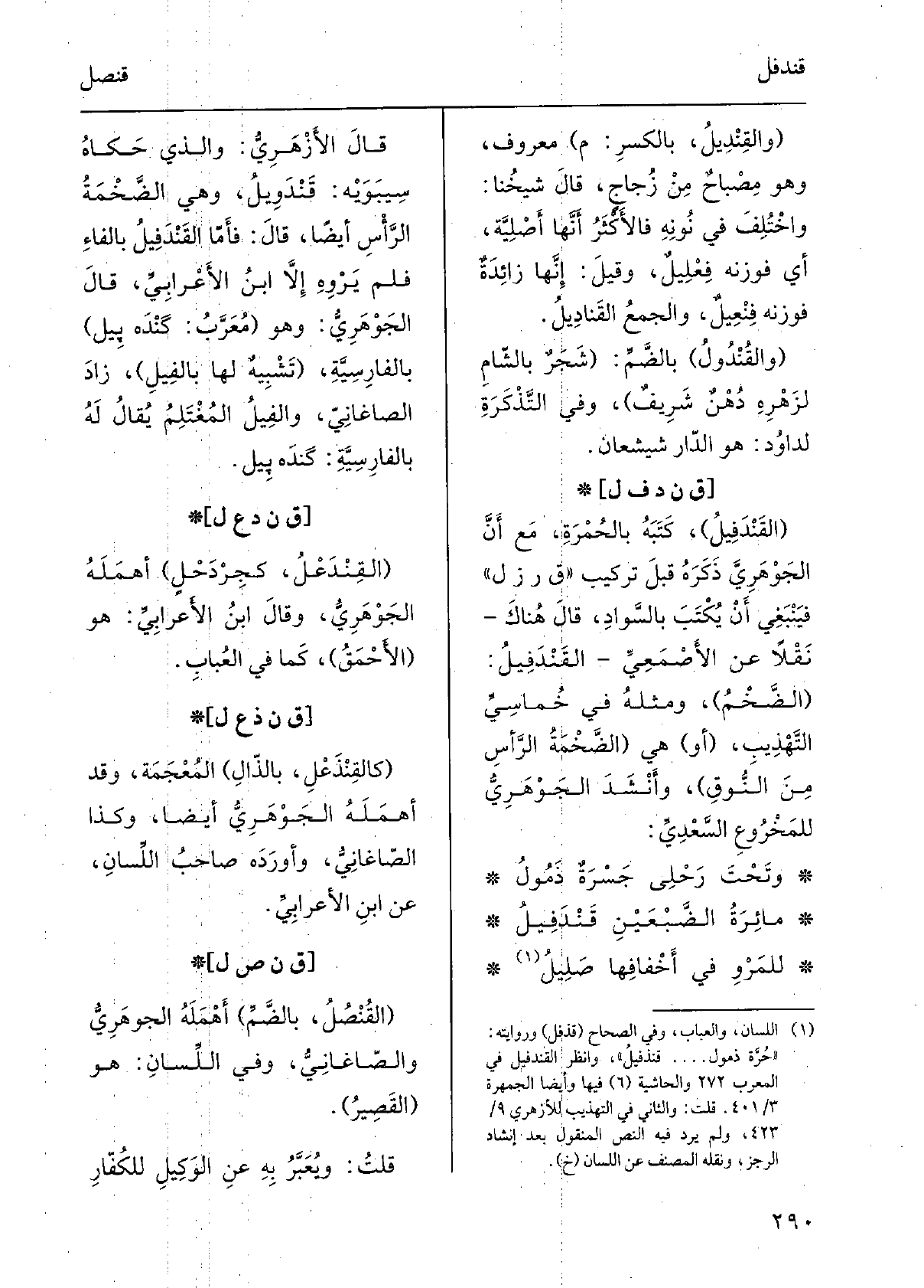 القَنْدَفِيل، كَتَبَه بالحُمرَةِ، مَعَ أنّ الجَوْهَرِيّ ذَكَرَه قبل تركيبِ قرزل فَيَنْبَغِي أَن يُكتبَ بالسَّوادِ، قَالَ هُنَاكَ نَقلاً عَن الأَصْمَعِيّ القَنْدَفيل: الضخمُ، ومثلُه فِي خُماسِيِّ التَّهْذِيب، أَو هِيَ الضخمةُ الرأسِ من النُّوقِ، وأنشدَ الجَوْهَرِيّ للمَخْروعِ السَّعْديِّ: وَتَحْتَ رَحْلِي جَسْرَةٌ ذَمُولُ مائِرَةُ الضَّبْعَيْنِ قَنْدَفيلُ للمَرْوِ فِي أَخْفَافِها صَليلُ قَالَ الأَزْهَرِيّ: وَالَّذِي حَكَاهُ سِيبَوَيْهٍ: قَنْدَويل، وَهِي الضخمةُ الرأسِ أَيْضا، قَالَ: فأمّا القَنْدَفيلُ بالفاءِ فَلم يَرْوِهِ إلاّ ابْن الأَعْرابِيّ، قَالَ الجَوْهَرِيّ: وَهُوَ مُعَرَّبُ: كَنْدَهْ بِيل بالفارِسيّة، تَشْبِيهٌ لَهَا بالفيلِ، زادَ الصَّاغانِيّ، والفيلُ المُغْتَلِمُ يُقَال لَهُ بالفارسيّة: كَنْدَهْ بِيل.