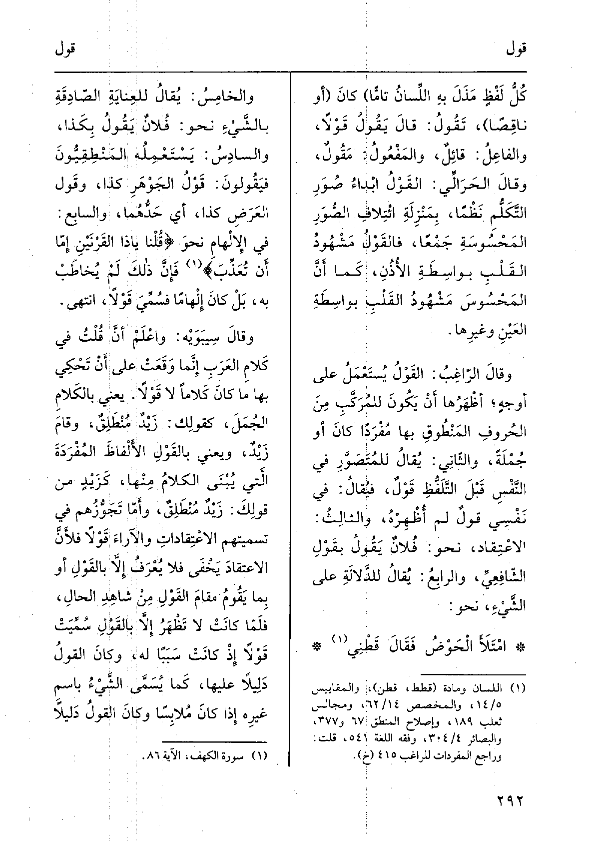 كلُّ لَفظٍ مَذَلَ بِهِ اللِّسان تامّاً كَانَ أَو ناقِصاً، تَقول: {قَالَ} يقولُ {قَوْلاً، وَالْفَاعِل:} قائِلٌ، وَالْمَفْعُول: {مَقُولٌ، وَقَالَ الحَرَاليّ: القَوْلُ ابْداءُ صُوَرِ التكَلُّمِ نَظْمَاً، بمنزلةِ ائْتِلافِ الصُّوَرِ المَحسوسةِ جَمْعَاً،} فالقَولُ مَشْهُودُ القَلبِ بواسطةِ الأُذُنِ، كَمَا أنّ المحسوسَ مَشْهُودُ القَلبِ بواسطةِ العَينِ وغيرِها. وَقَالَ الراغبُ: القَولُ يُستعمَلُ على أَوْجُهٍ أَظْهَرُها أَن يكونَ للمُرَكَّبِ من الحروفِ المَنْطوقِ بهَا مُفرداً كَانَ أَو جُملَةً، وَالثَّانِي: يُقال للمُتَصَوَّرِ فِي النَّفسِ قبلَ التلَفُّظِ {قَوْلٌ، فَيُقَال: فِي نَفْسِي قولٌ لم أُظْهِرْه، وَالثَّالِث: الِاعْتِقَاد، نَحْو: فلانٌ يقولُ} بقَوْلِ الشافعيِّ، وَالرَّابِع: يُقَال للدَّلالَةِ على الشيءِ، نَحْو: امْتَلأَ الحَوضُ {فقالَ قَطْنِي والخامسُ: يُقَال للعِنايةِ الصادقةِ بالشيءِ نَحْو: فلانٌ يقولُ بِكَذَا، وَالسَّادِس: يستعملُه المَنْطِقيُّونَ فَيَقُولُونَ: قَوْلُ الجَوْهَرِ كَذَا، وقولُ العَرَضِ كَذَا، أَي حدُّهما، وَالسَّابِع: فِي الإلهامِ نحوَ:} قُلْنا يَا ذَا القَرنَيْنِ إمّا أَن تُعَذِّبَ فإنّ ذَلِك لم يُخاطَبْ بِهِ، بل كَانَ إلْهاماً فسُمِّي قَوْلاً، انْتهى. وَقَالَ سِيبَوَيْهٍ: واعْلَمْ أنّ {قُلْتُ فِي كَلَام العربِ إنّما وَقَعَتْ على أَن تحكي بهَا مَا كانَ كَلاماً لَا قَوْلاً.